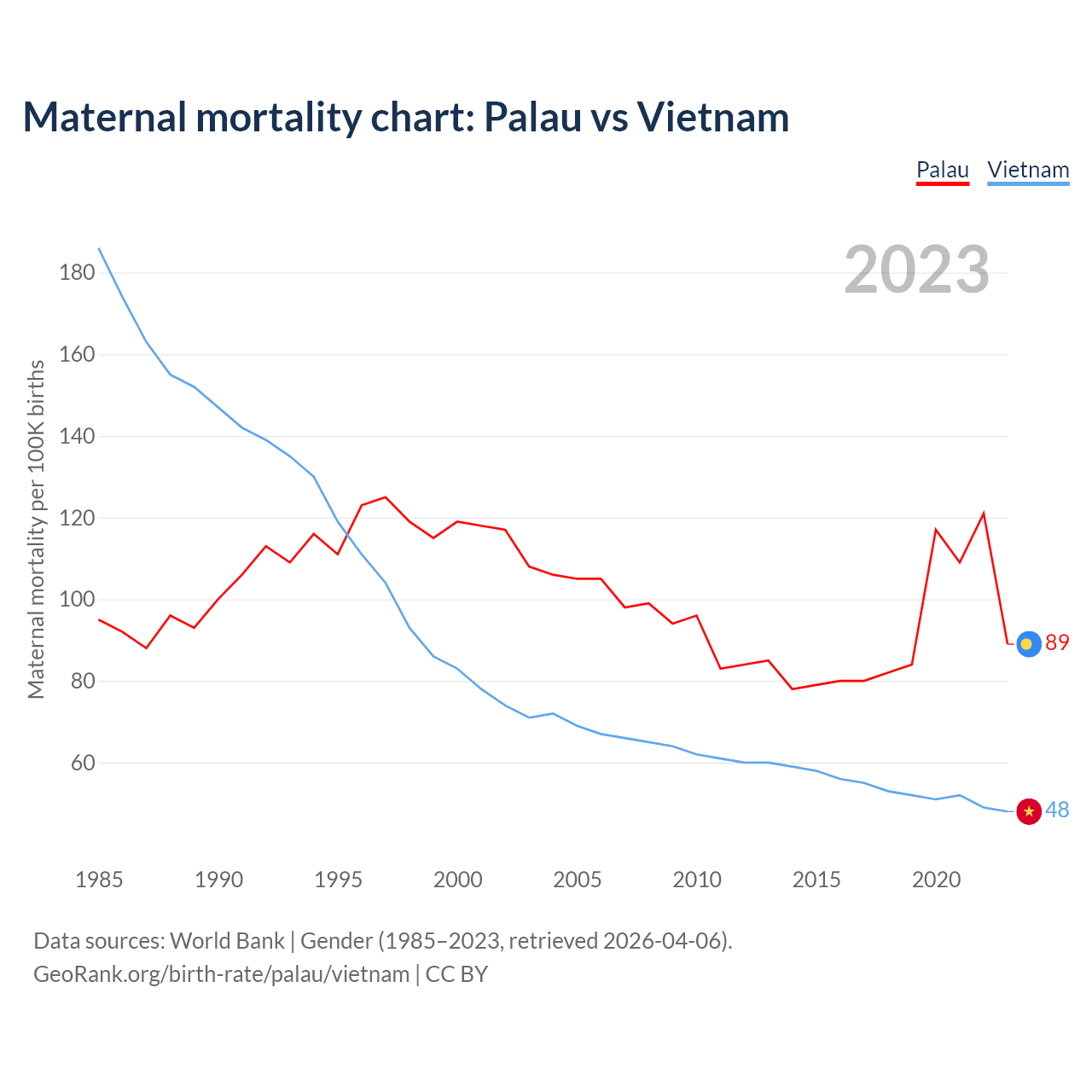 The maternal mortality rate, which is the probability of dying during childbirth or within 42 days of pregnancy termination, is 89 deaths per 100,000 live births in Palau, compared to 48 deaths in Vietnam.