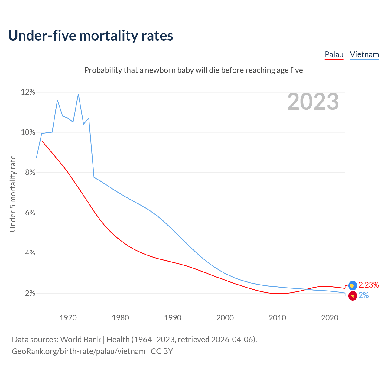 The chance that a newborn baby will die before reaching age five is 2.23% in Palau and 2% in Vietnam. Above is a chart with historical data on under-five mortality rates.