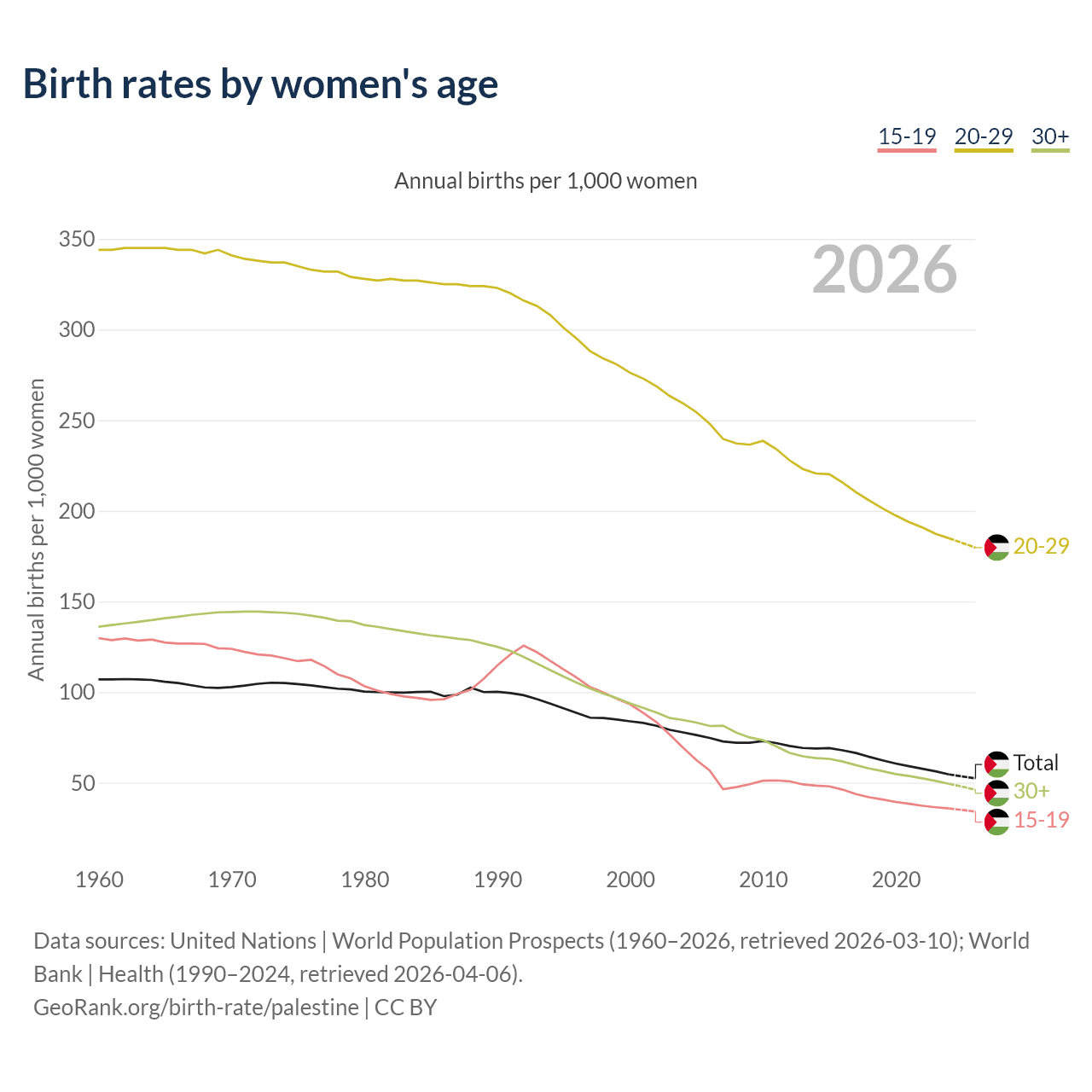 Palestine has a birth rate of 27.1 (annual births per 1,000 people) and a fertility rate of 3.31 (the average number of children a woman is expected to have over her lifetime based on current age-specific birth rates).