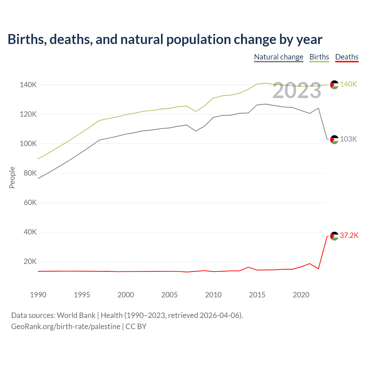 In 2023, Palestine ranks 78/196 for absolute natural population change and 47/196 for natural change rate, where a lower rank number indicates faster natural growth and a higher number indicates greater decline.