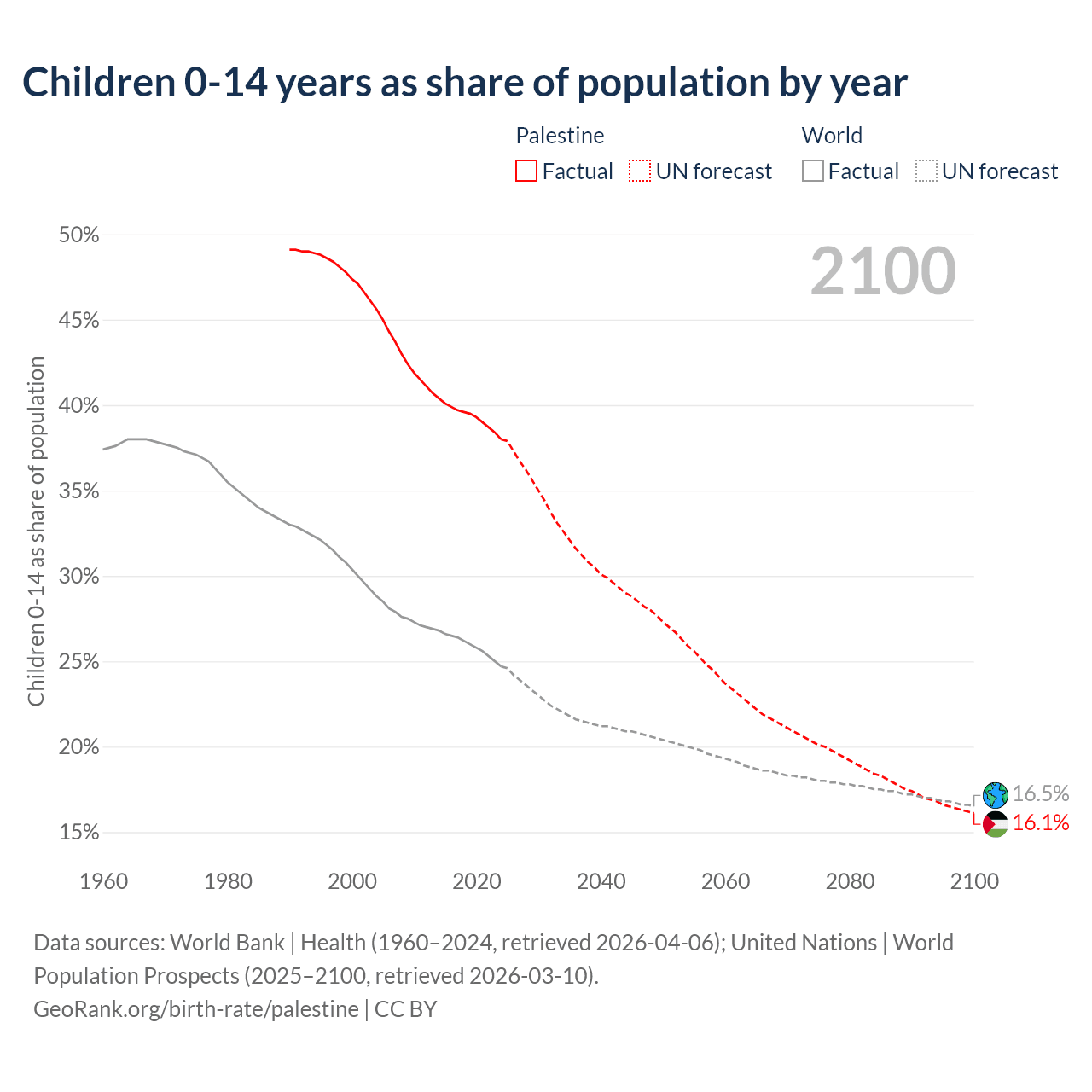 According to the latest birth rate data available, the fertility rate in Palestine is 3.31, which is above the replacement level of 2.1 children per woman. In 1993, the fertility rate was 6.5 — a 49.1% decline in 30 years.