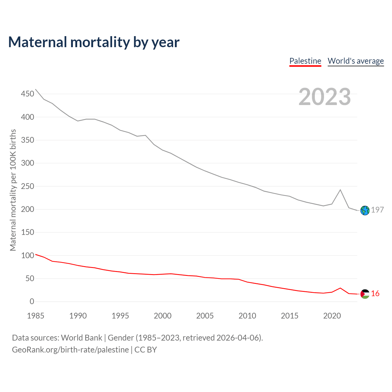 The maternal mortality rate in Palestine was 16 deaths per 100,000 live births in 2023 — a 0.02% chance of dying during childbirth or within 42 days of pregnancy termination. This is a 72.9% decrease compared to the year 2000.