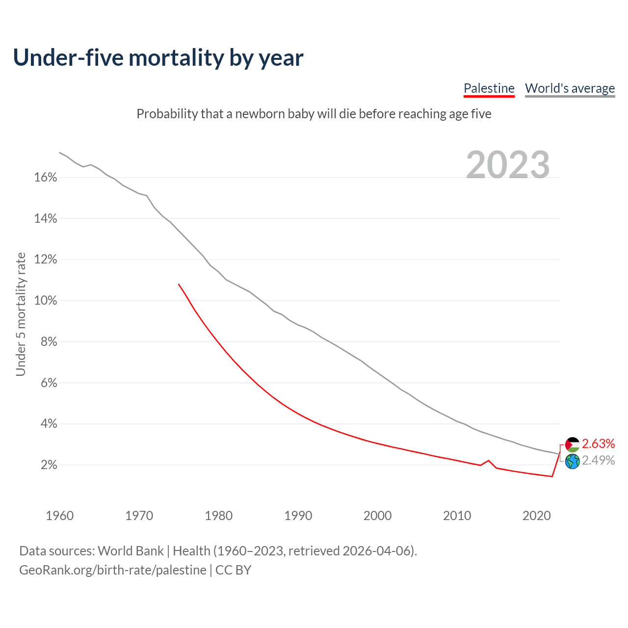 The under-5 mortality rate in Palestine was 26.3 deaths per 1,000 live births in 2023 — a 2.63% chance that a newborn baby will die before reaching age five. This is down from 30.3 deaths per 1,000 live births in 2000.