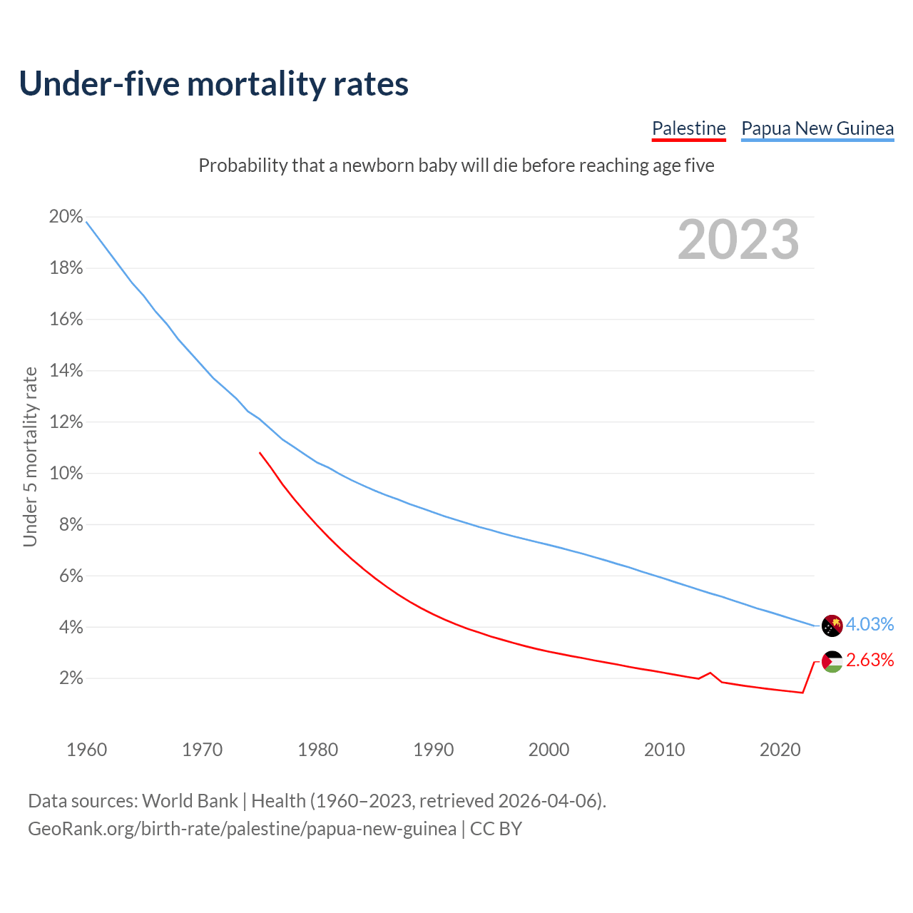 The chance that a newborn baby will die before reaching age five is 2.63% in Palestine and 4.03% in Papua New Guinea. Above is a chart with historical data on under-five mortality rates.