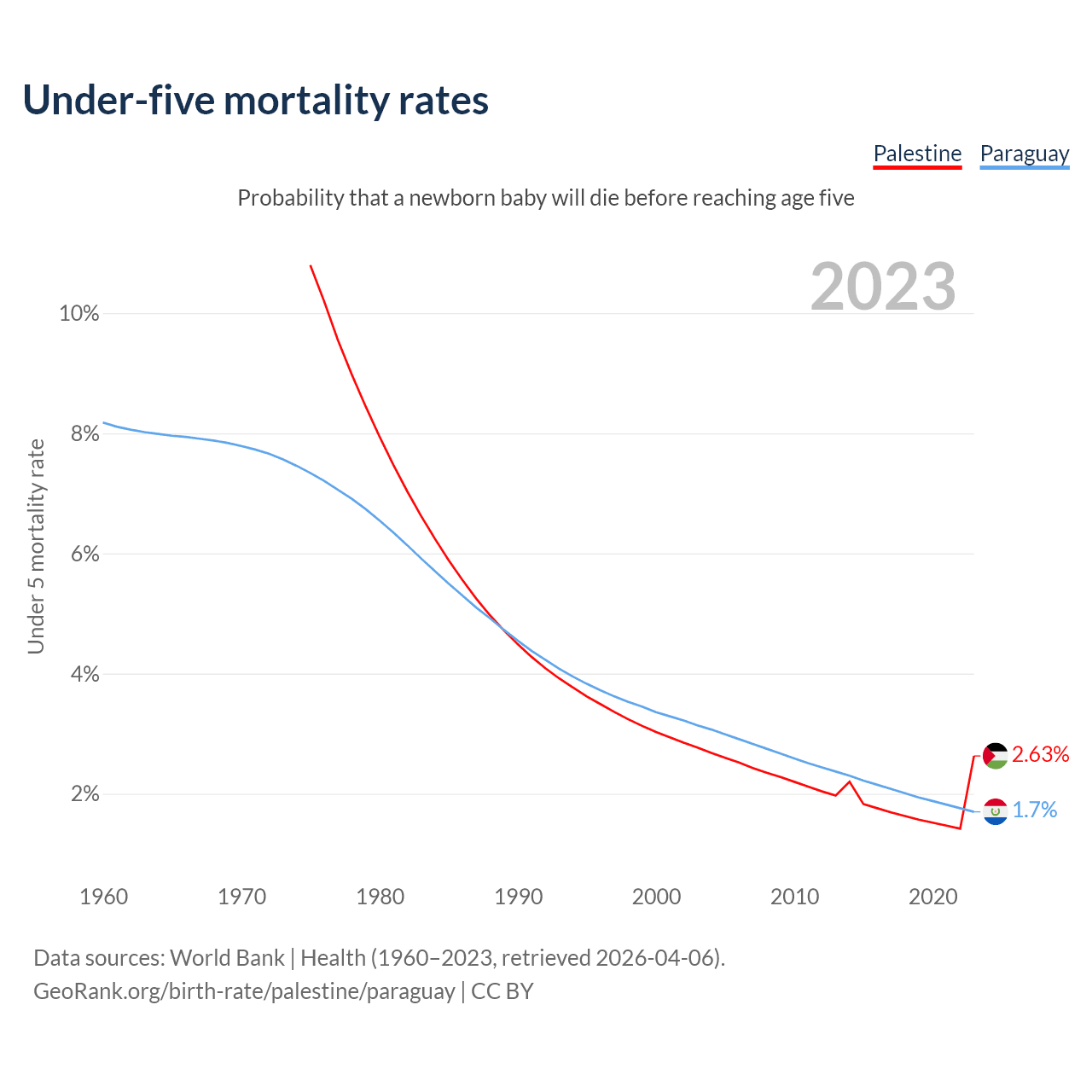 The chance that a newborn baby will die before reaching age five is 2.63% in Palestine and 1.7% in Paraguay. Above is a chart with historical data on under-five mortality rates.