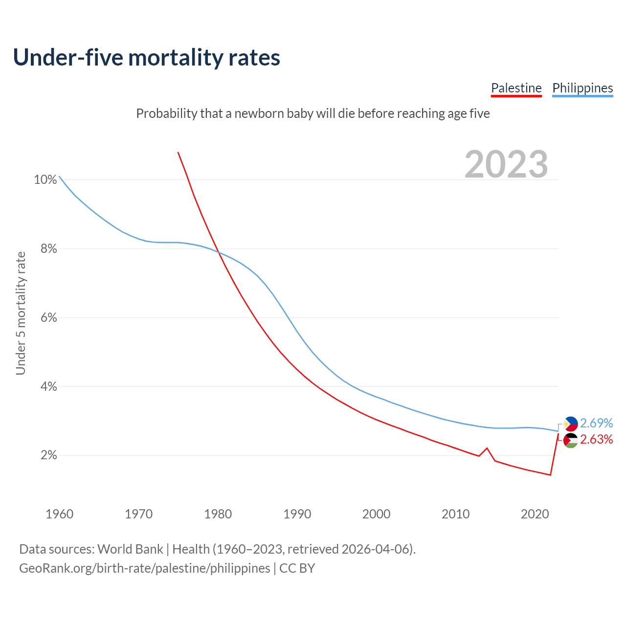 The chance that a newborn baby will die before reaching age five is 2.63% in Palestine and 2.69% in the Philippines. Above is a chart with historical data on under-five mortality rates.