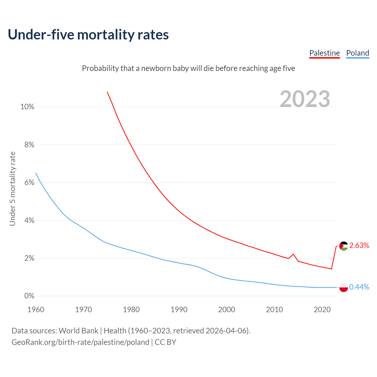 The chance that a newborn baby will die before reaching age five is 2.63% in Palestine and 0.44% in Poland. Above is a chart with historical data on under-five mortality rates.