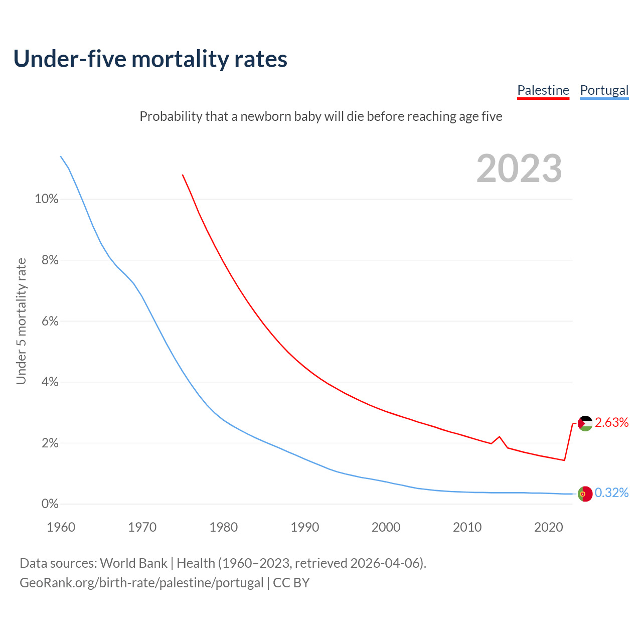 The chance that a newborn baby will die before reaching age five is 2.63% in Palestine and 0.32% in Portugal. Above is a chart with historical data on under-five mortality rates.