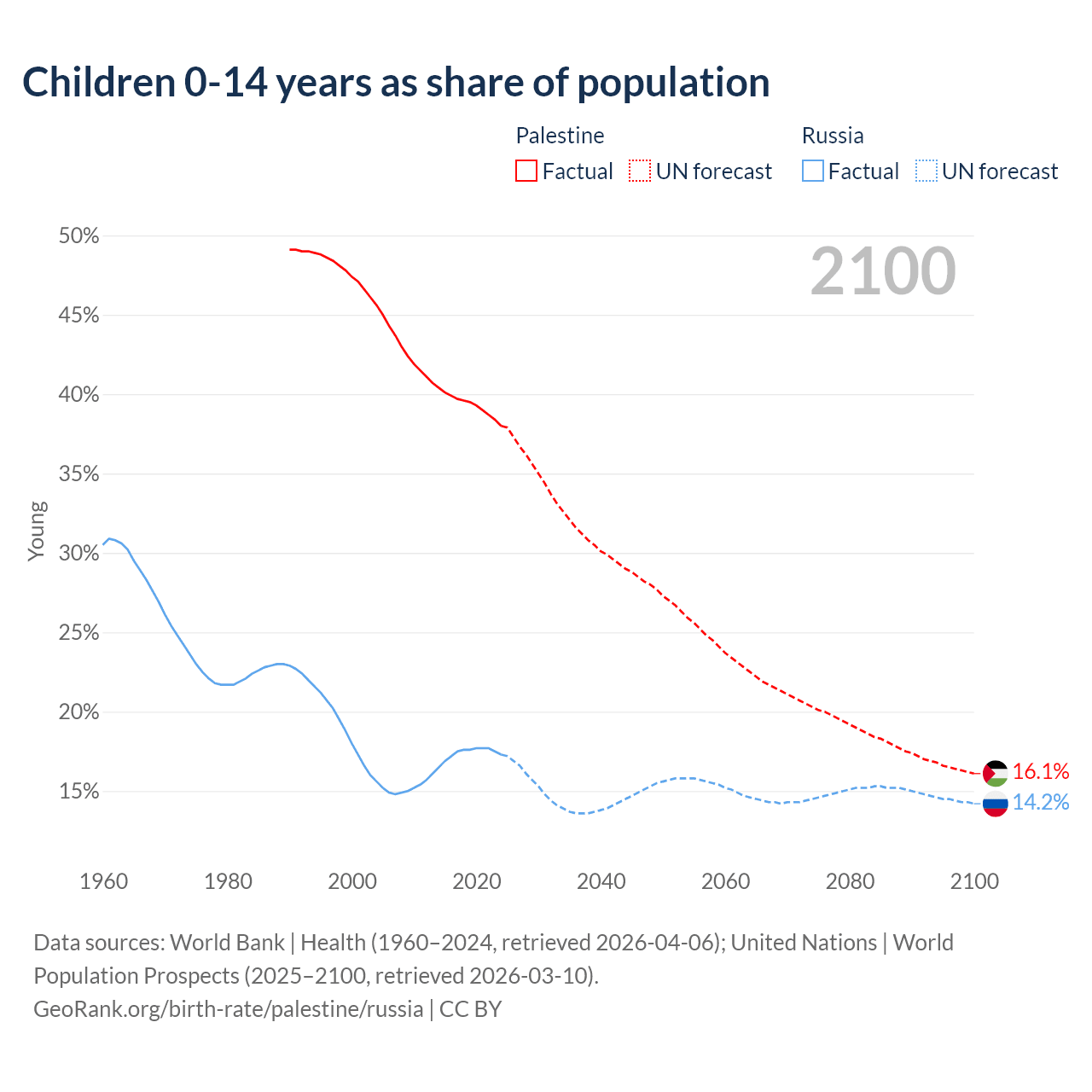 Palestine has an annual birth rate of 27.1 births per 1,000 people, compared to 8.6 for Russia. The average number of children a woman is expected to have during her lifetime — the fertility rate, is 3.31 in Palestine and 1.41 in Russia — 57.4% difference.