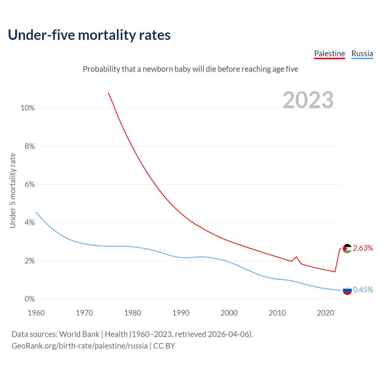 The chance that a newborn baby will die before reaching age five is 2.63% in Palestine and 0.45% in Russia. Above is a chart with historical data on under-five mortality rates.