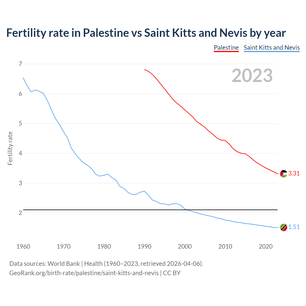 1990 vs 2023, the fertility rate has decreased by 51.4% in Palestine and by 44.8% in Saint Kitts and Nevis — in 1990, it was 6.81 and 2.73, respectively.