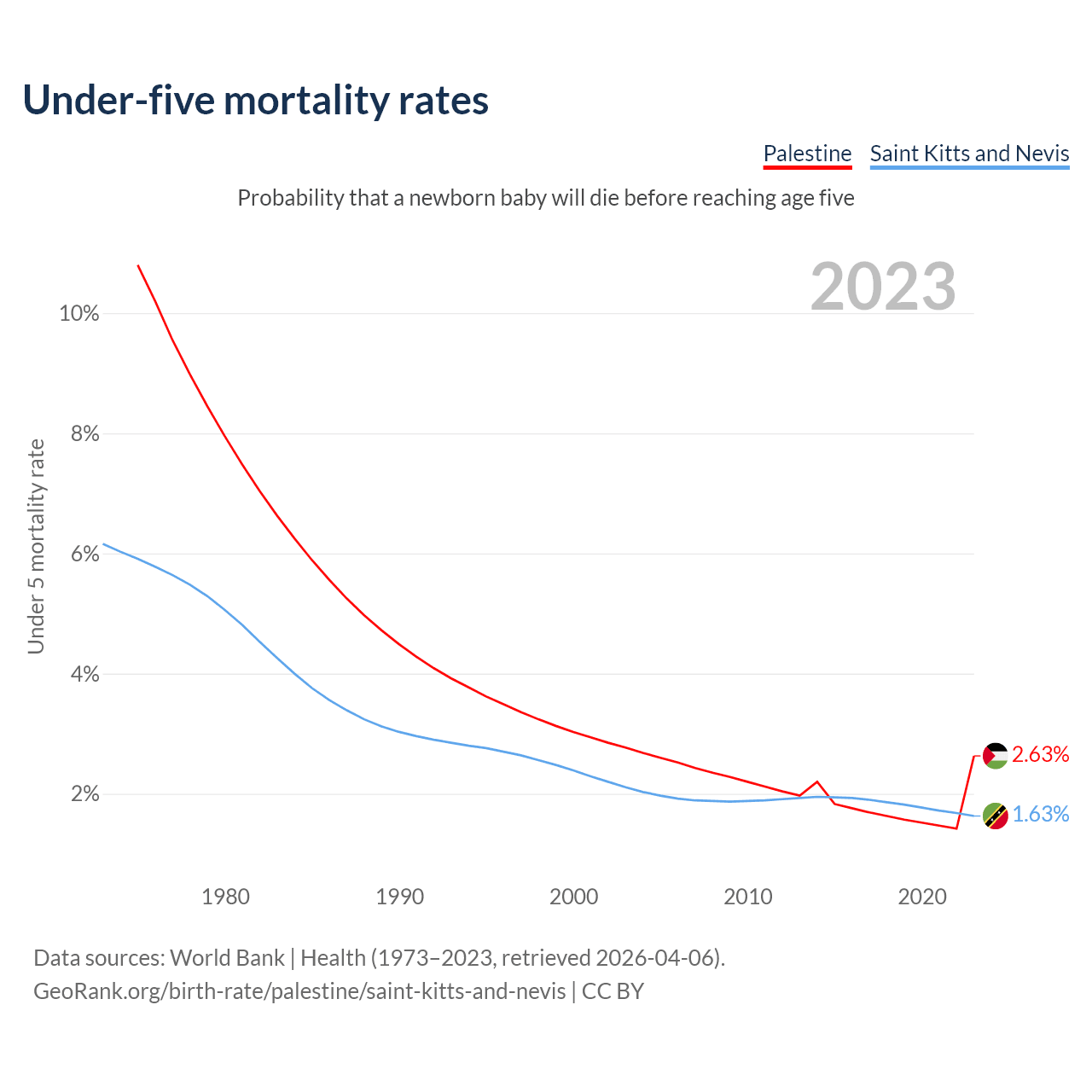 The chance that a newborn baby will die before reaching age five is 2.63% in Palestine and 1.63% in Saint Kitts and Nevis. Above is a chart with historical data on under-five mortality rates.