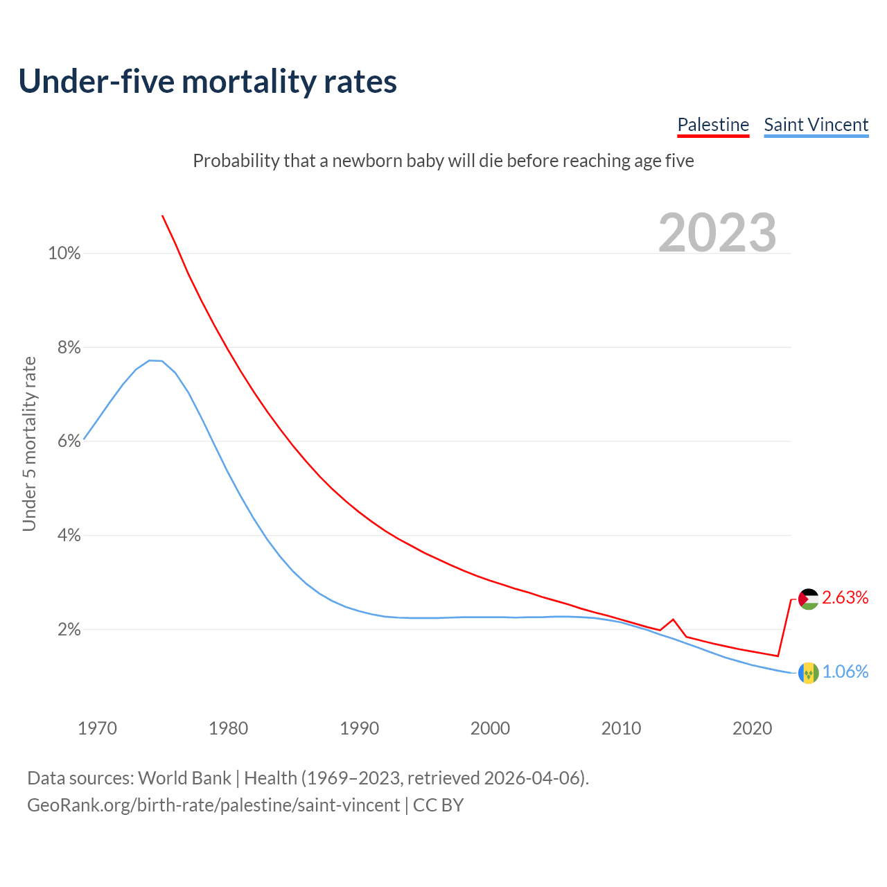 The chance that a newborn baby will die before reaching age five is 2.63% in Palestine and 1.06% in Saint Vincent. Above is a chart with historical data on under-five mortality rates.