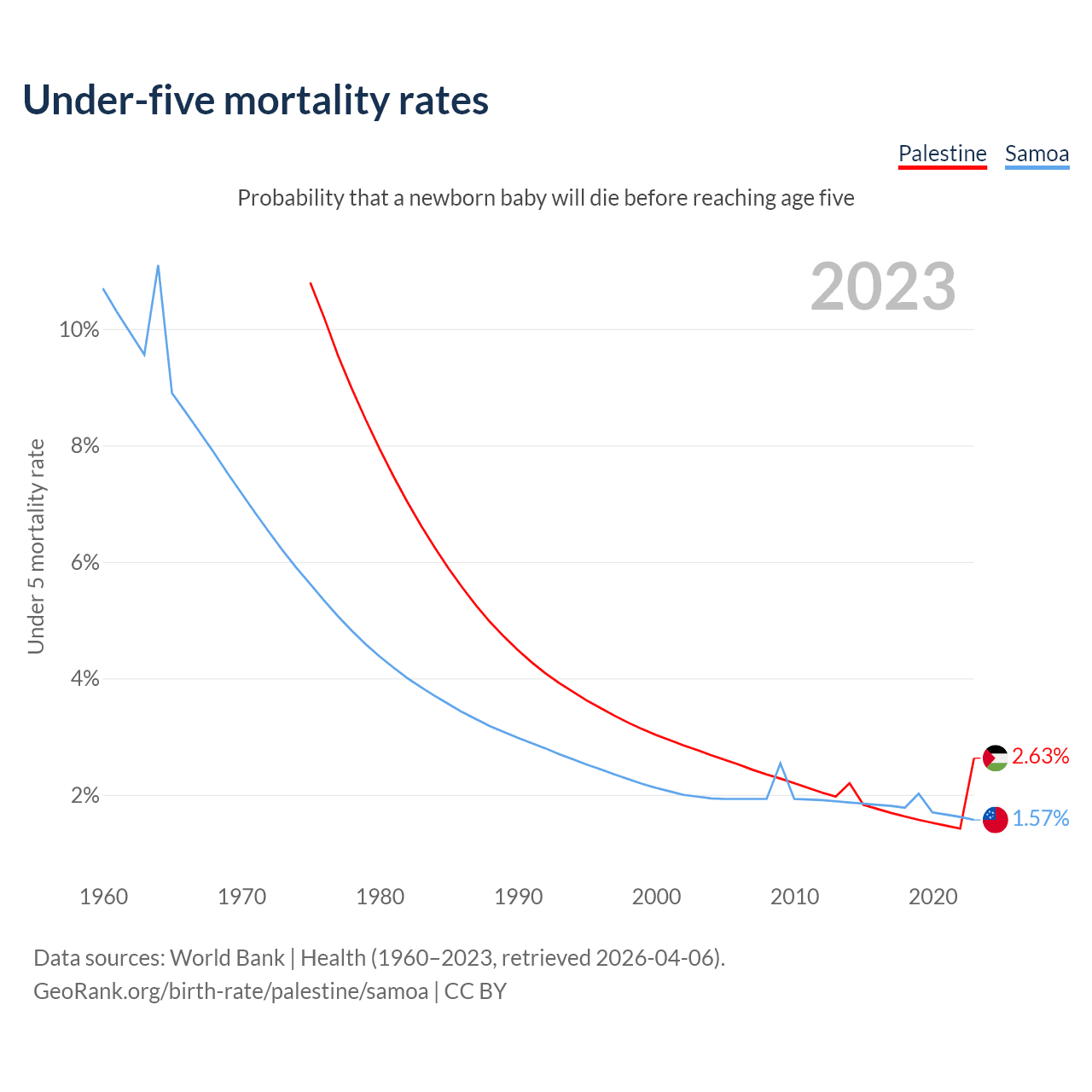 The chance that a newborn baby will die before reaching age five is 2.63% in Palestine and 1.57% in Samoa. Above is a chart with historical data on under-five mortality rates.