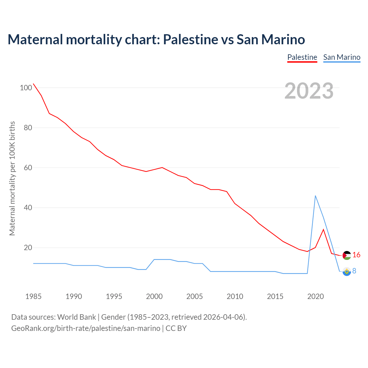 The maternal mortality rate, which is the probability of dying during childbirth or within 42 days of pregnancy termination, is 16 deaths per 100,000 live births in Palestine, compared to 8 deaths in San Marino.