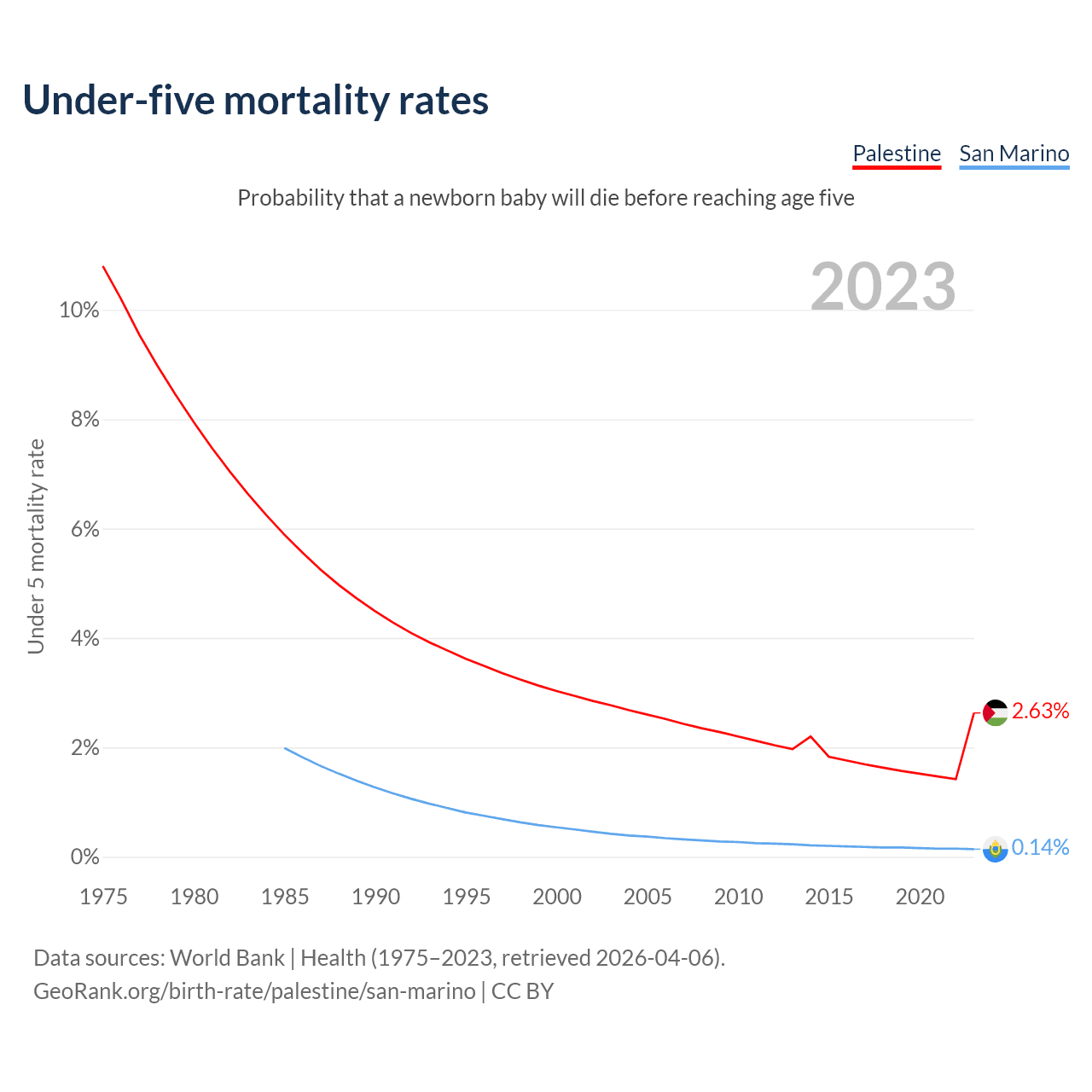 The chance that a newborn baby will die before reaching age five is 2.63% in Palestine and 0.14% in San Marino. Above is a chart with historical data on under-five mortality rates.