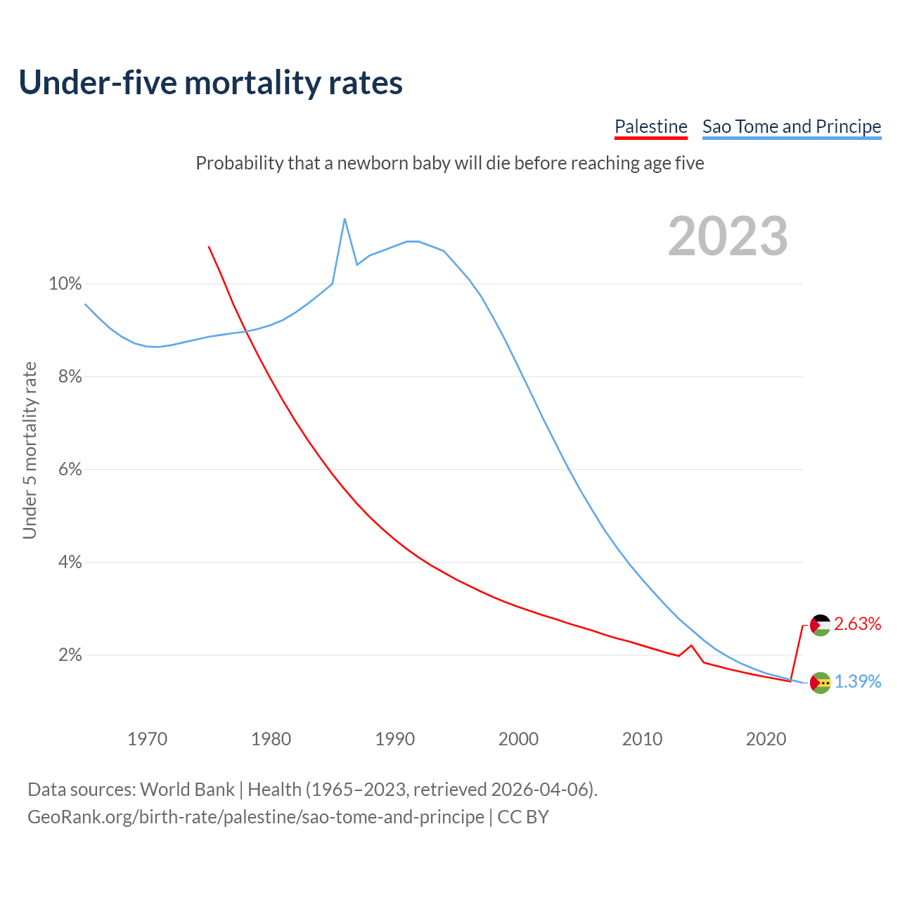 The chance that a newborn baby will die before reaching age five is 2.63% in Palestine and 1.39% in Sao Tome and Principe. Above is a chart with historical data on under-five mortality rates.