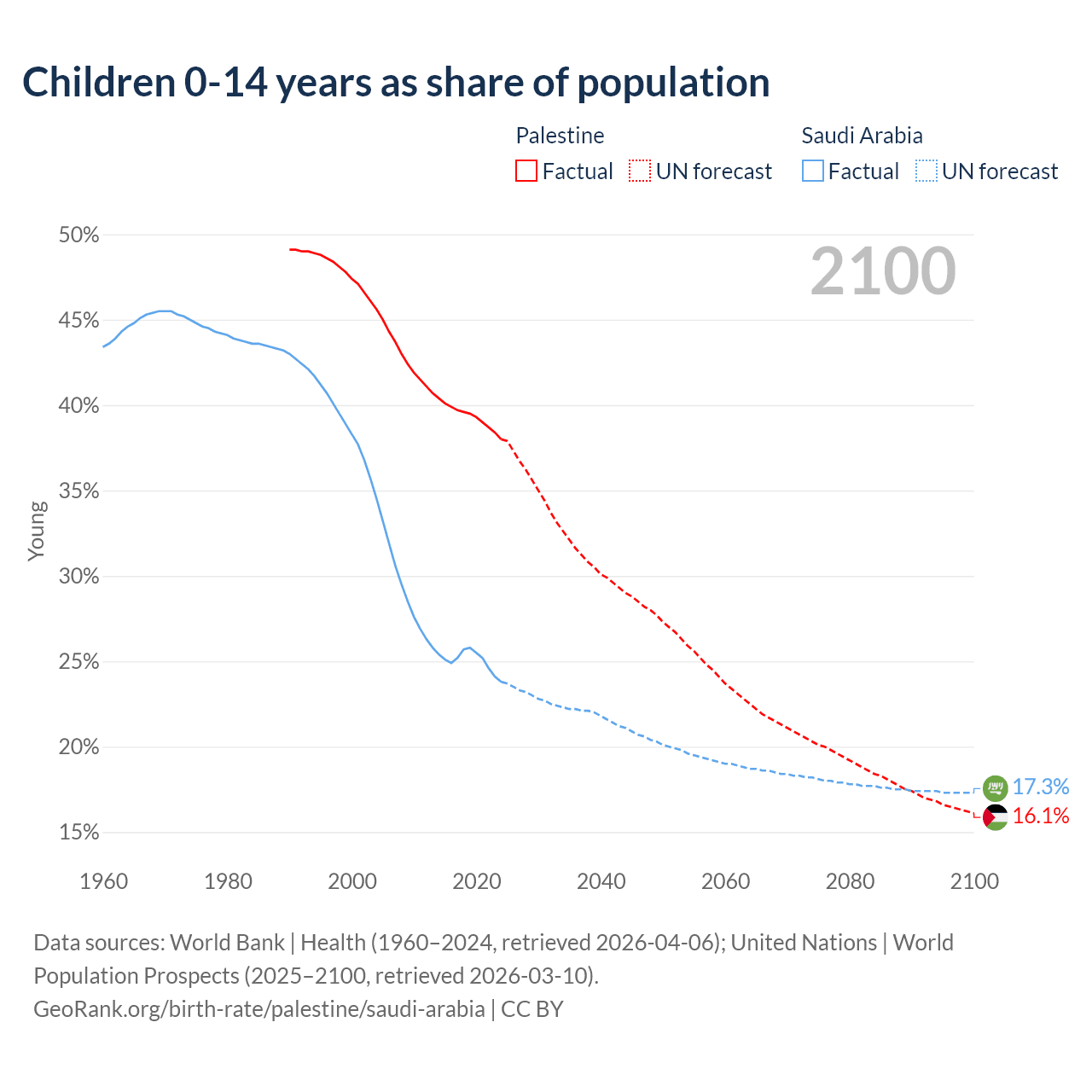 Palestine has an annual birth rate of 27.1 births per 1,000 people, compared to 16.4 for Saudi Arabia. The average number of children a woman is expected to have during her lifetime — the fertility rate, is 3.31 in Palestine and 2.28 in Saudi Arabia — 31.1% difference.