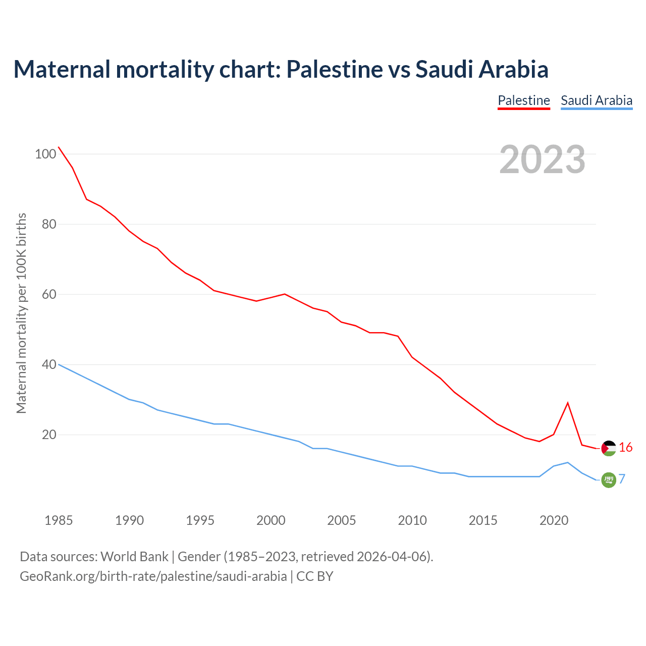 The maternal mortality rate, which is the probability of dying during childbirth or within 42 days of pregnancy termination, is 16 deaths per 100,000 live births in Palestine, compared to 7 deaths in Saudi Arabia.