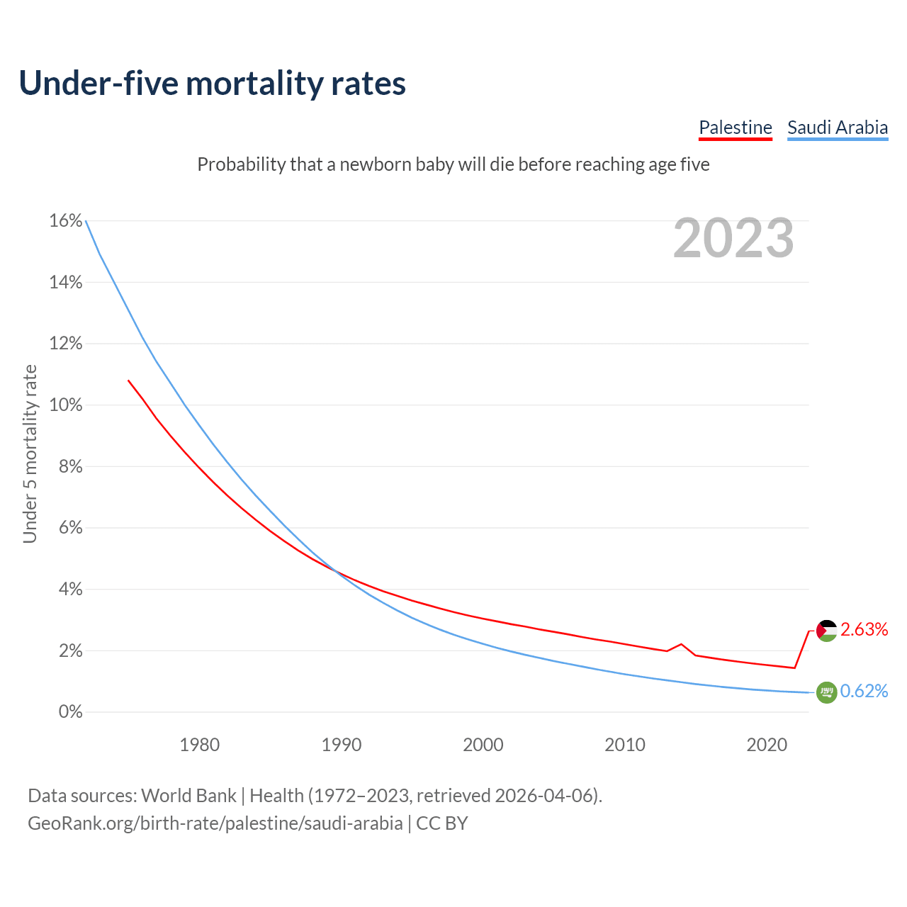 The chance that a newborn baby will die before reaching age five is 2.63% in Palestine and 0.62% in Saudi Arabia. Above is a chart with historical data on under-five mortality rates.
