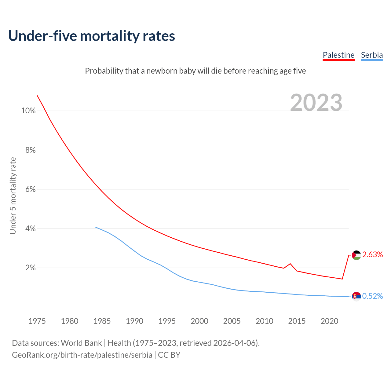 The chance that a newborn baby will die before reaching age five is 2.63% in Palestine and 0.52% in Serbia. Above is a chart with historical data on under-five mortality rates.