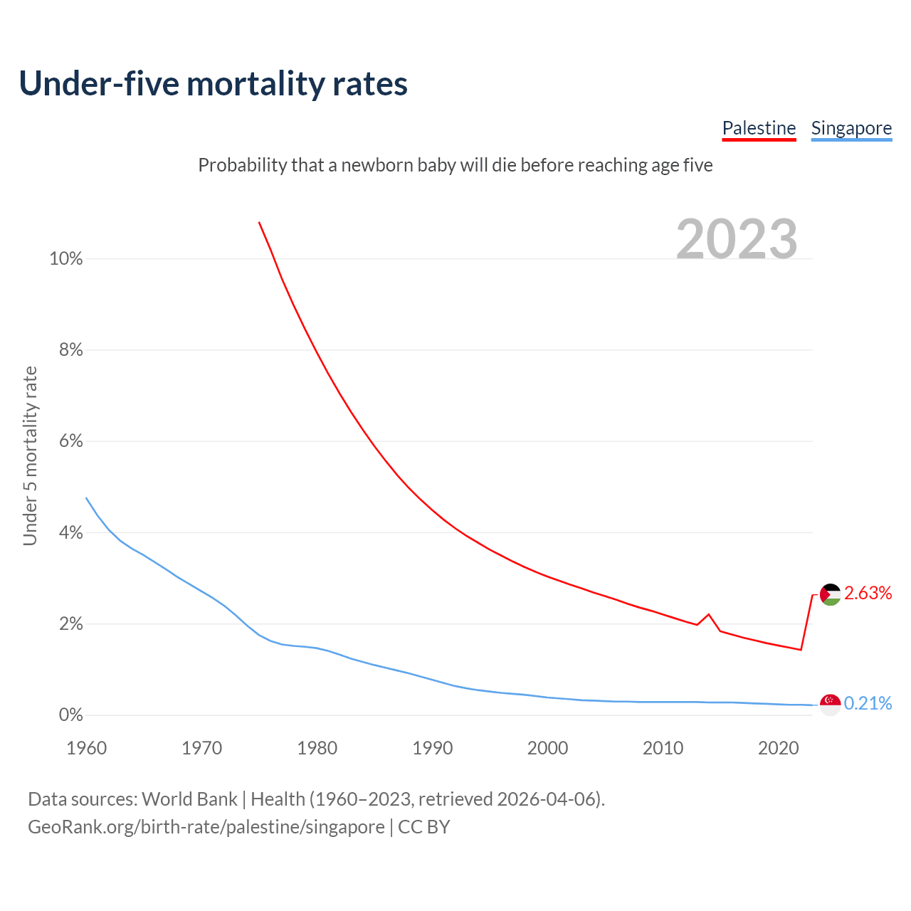The chance that a newborn baby will die before reaching age five is 2.63% in Palestine and 0.21% in Singapore. Above is a chart with historical data on under-five mortality rates.