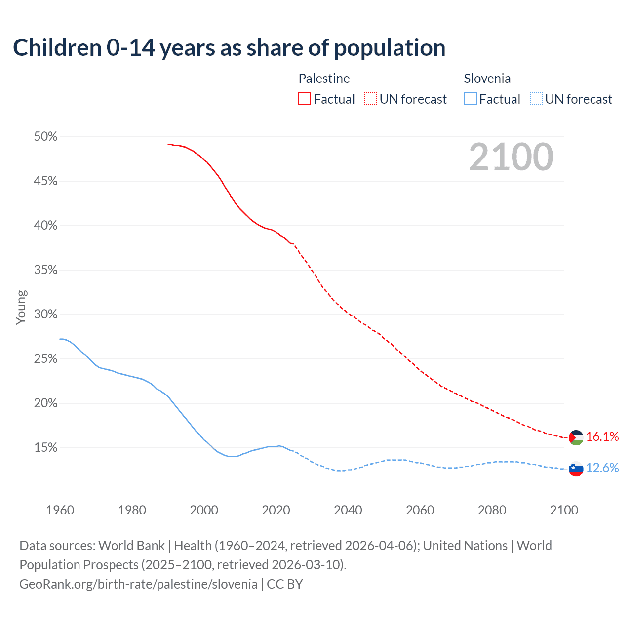 Palestine has an annual birth rate of 27.1 births per 1,000 people, compared to 8 for Slovenia. The average number of children a woman is expected to have during her lifetime — the fertility rate, is 3.31 in Palestine and 1.51 in Slovenia — 54.4% difference.