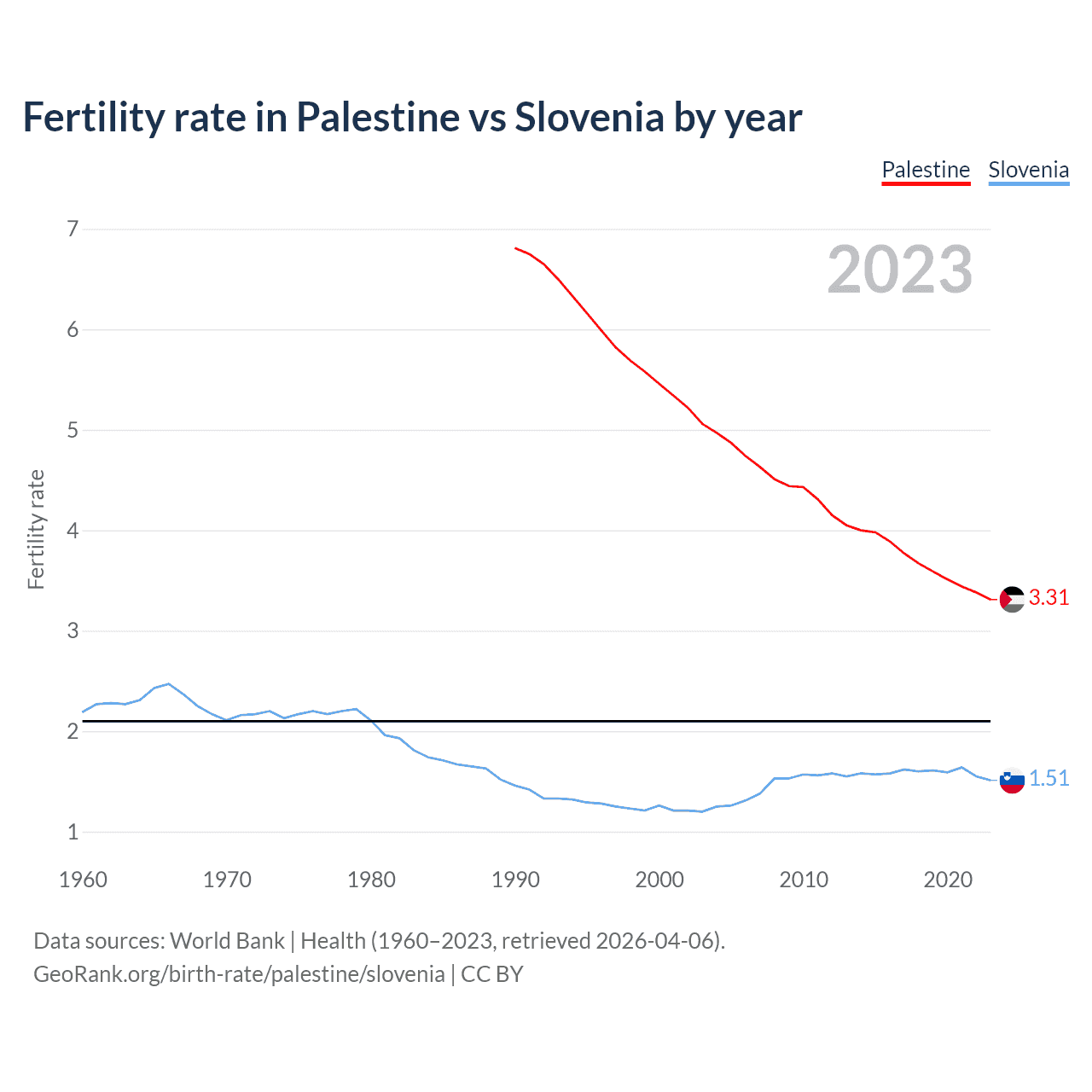 1990 vs 2023, the fertility rate has changed by 51.4% in Palestine and by +3.42% in Slovenia — in 1990, it was 6.81 and 1.46, respectively.