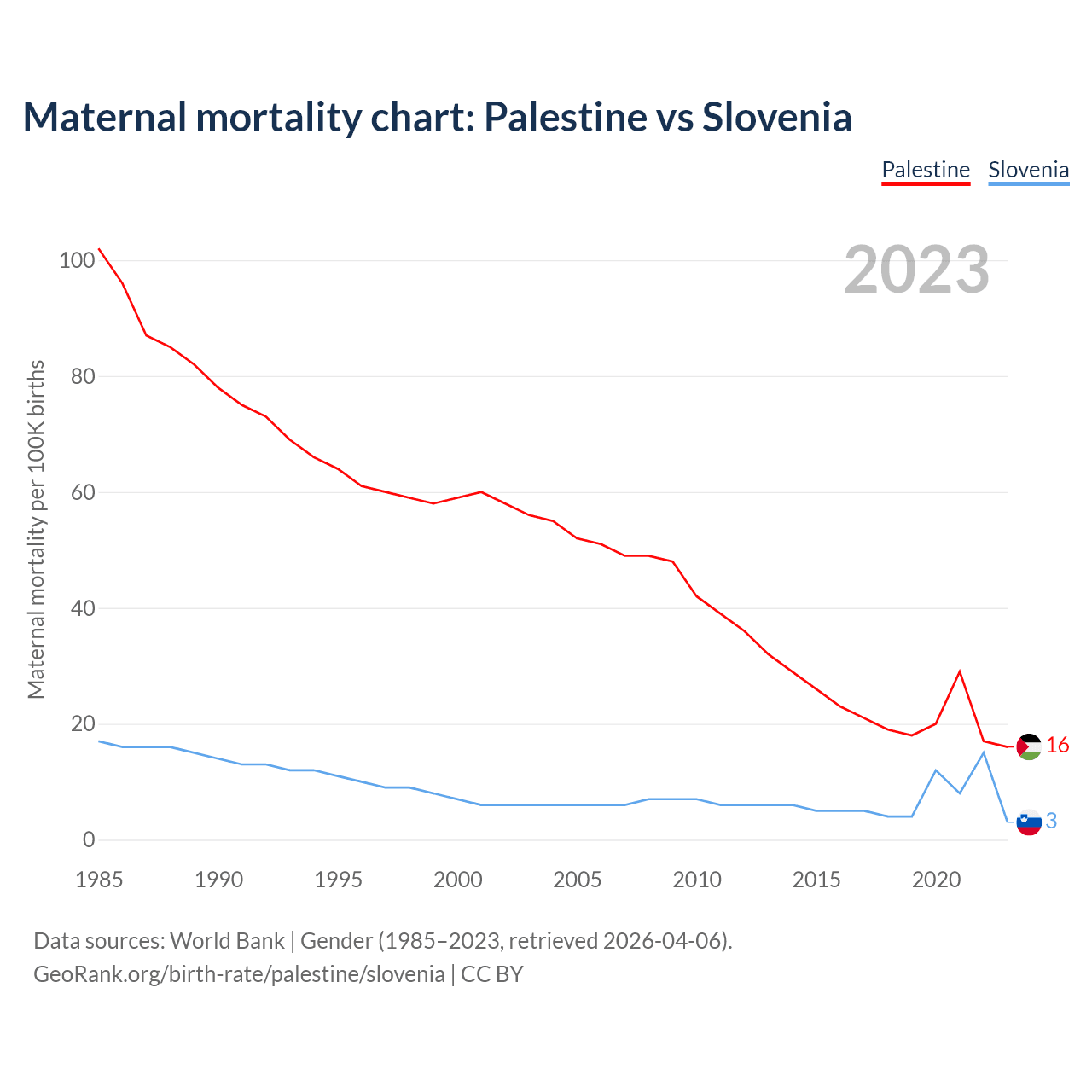 The maternal mortality rate, which is the probability of dying during childbirth or within 42 days of pregnancy termination, is 16 deaths per 100,000 live births in Palestine, compared to 3 deaths in Slovenia.