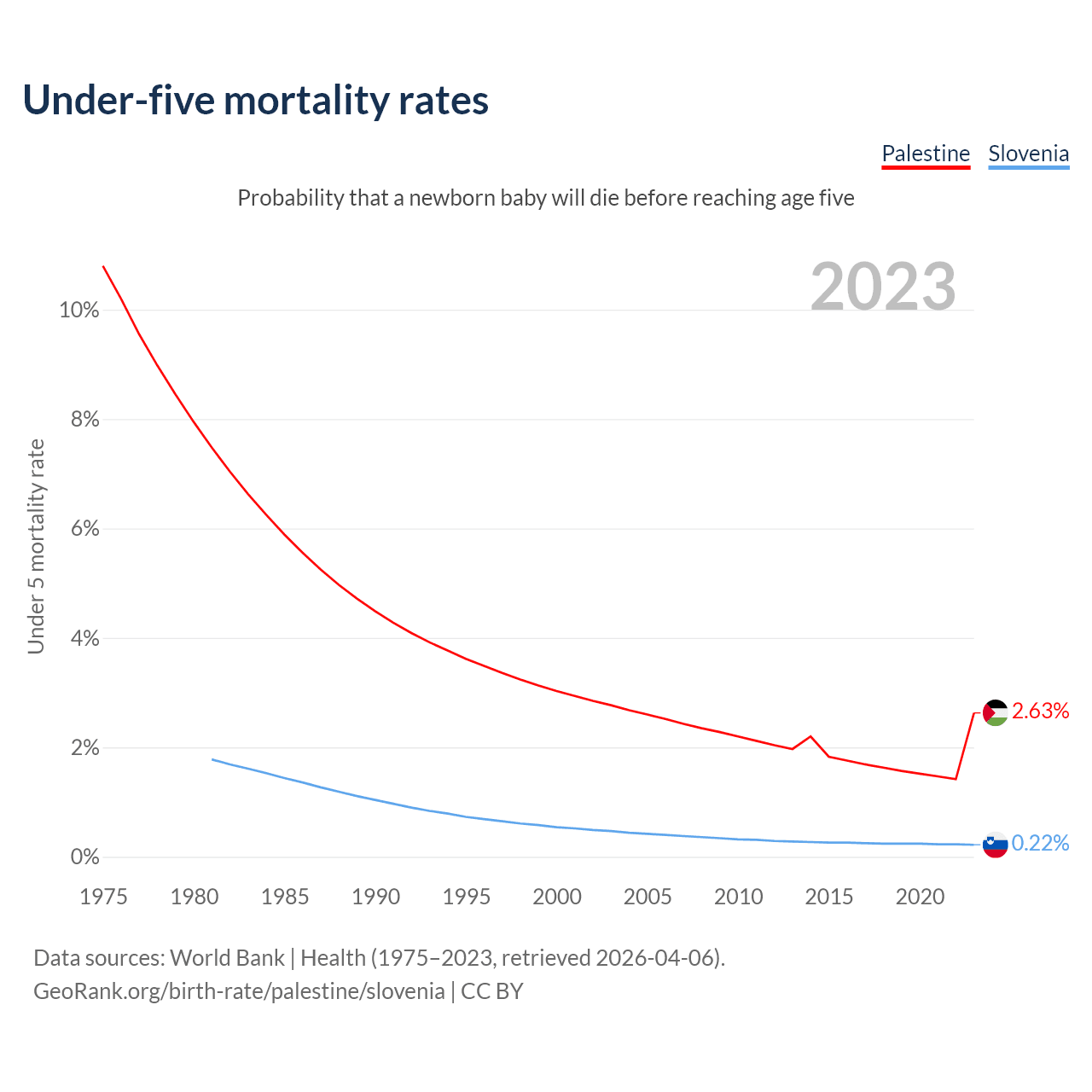 The chance that a newborn baby will die before reaching age five is 2.63% in Palestine and 0.22% in Slovenia. Above is a chart with historical data on under-five mortality rates.
