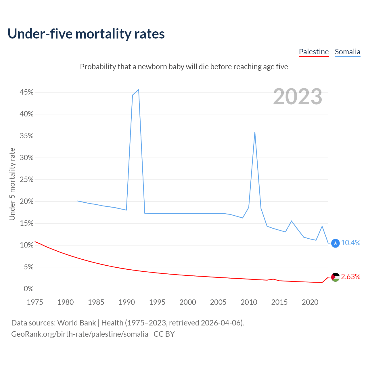 The chance that a newborn baby will die before reaching age five is 2.63% in Palestine and 10.4% in Somalia. Above is a chart with historical data on under-five mortality rates.