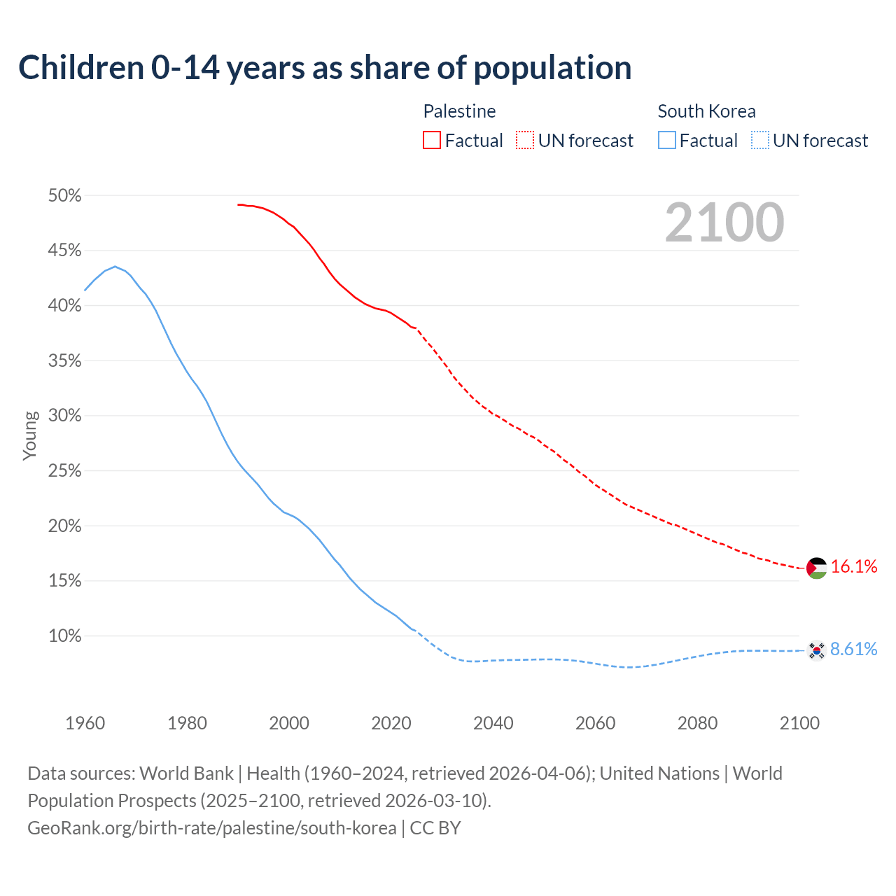 Palestine has an annual birth rate of 27.1 births per 1,000 people, compared to 4.5 for South Korea. The average number of children a woman is expected to have during her lifetime — the fertility rate, is 3.31 in Palestine and 0.72 in South Korea — 78.2% difference.