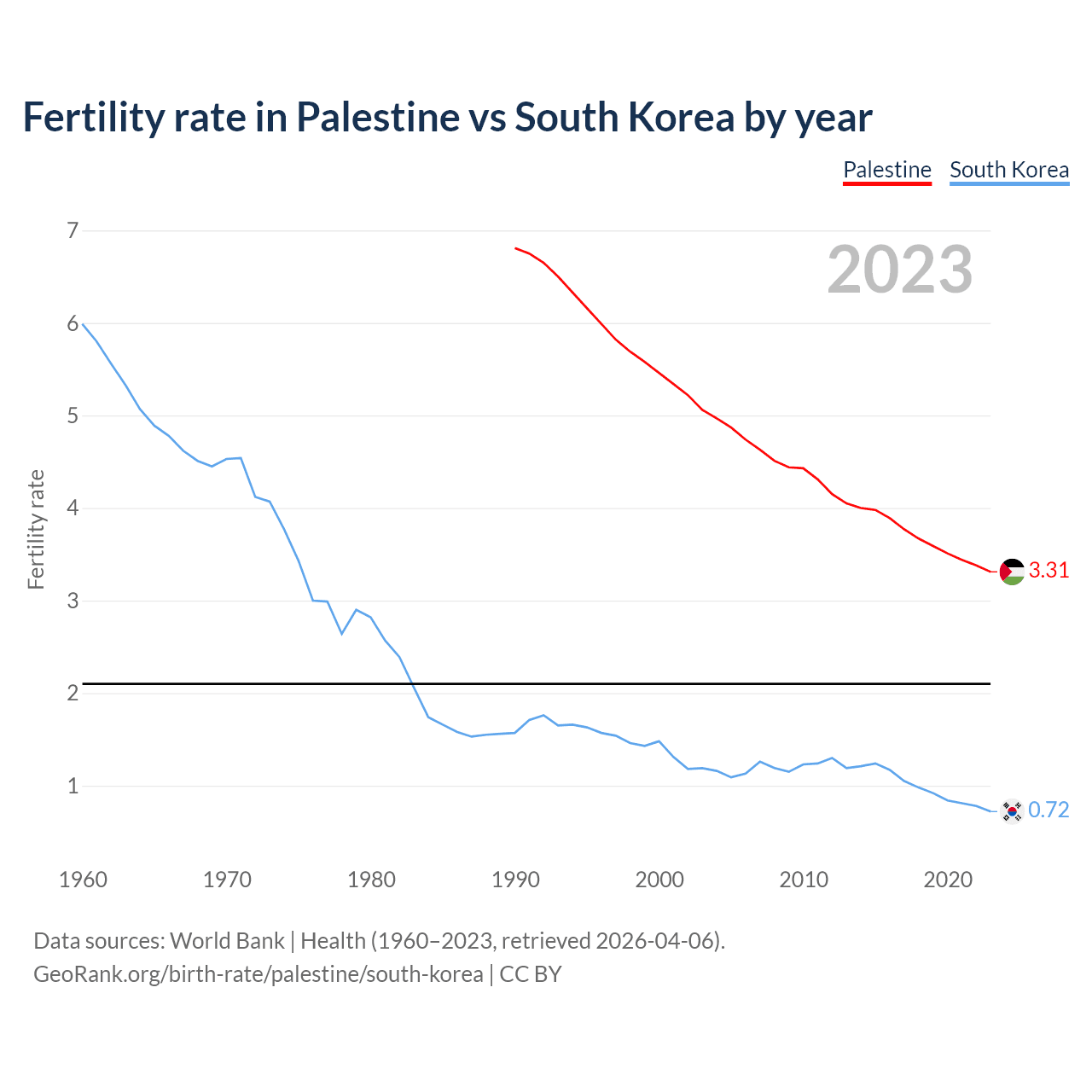 According to the latest available data on birth rates, the fertility rate in Palestine was 3.31 children per woman in 2023, compared to 0.72 in South Korea in 2023. The replacement level is considered to be 2.1 children per woman.