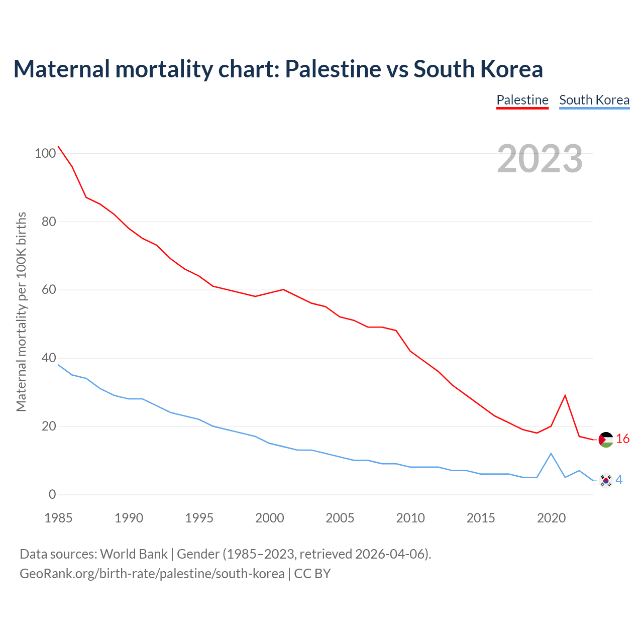 The maternal mortality rate, which is the probability of dying during childbirth or within 42 days of pregnancy termination, is 16 deaths per 100,000 live births in Palestine, compared to 4 deaths in South Korea.