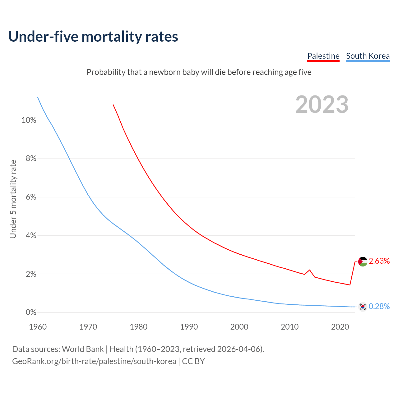 The chance that a newborn baby will die before reaching age five is 2.63% in Palestine and 0.28% in South Korea. Above is a chart with historical data on under-five mortality rates.