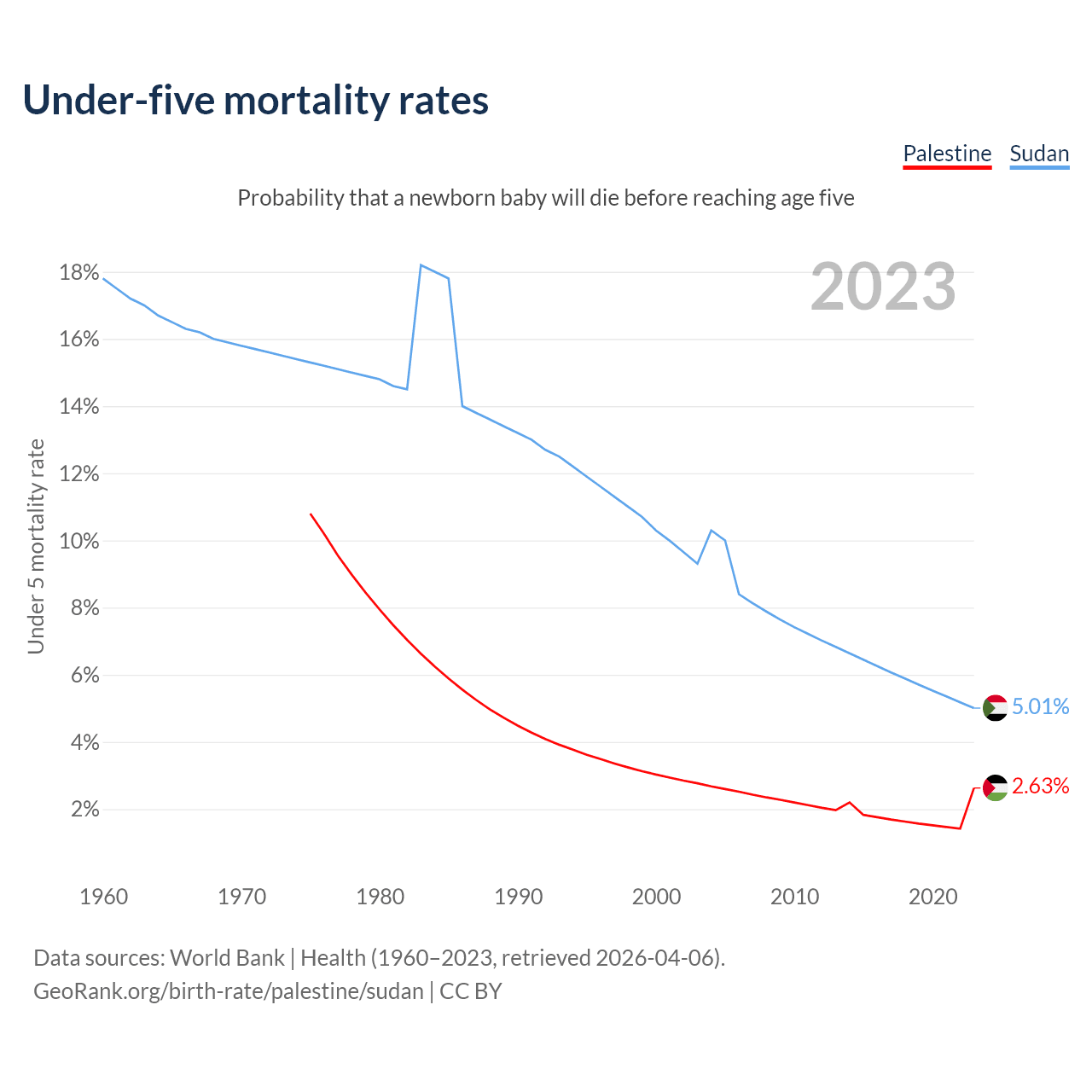 The chance that a newborn baby will die before reaching age five is 2.63% in Palestine and 5.01% in Sudan. Above is a chart with historical data on under-five mortality rates.