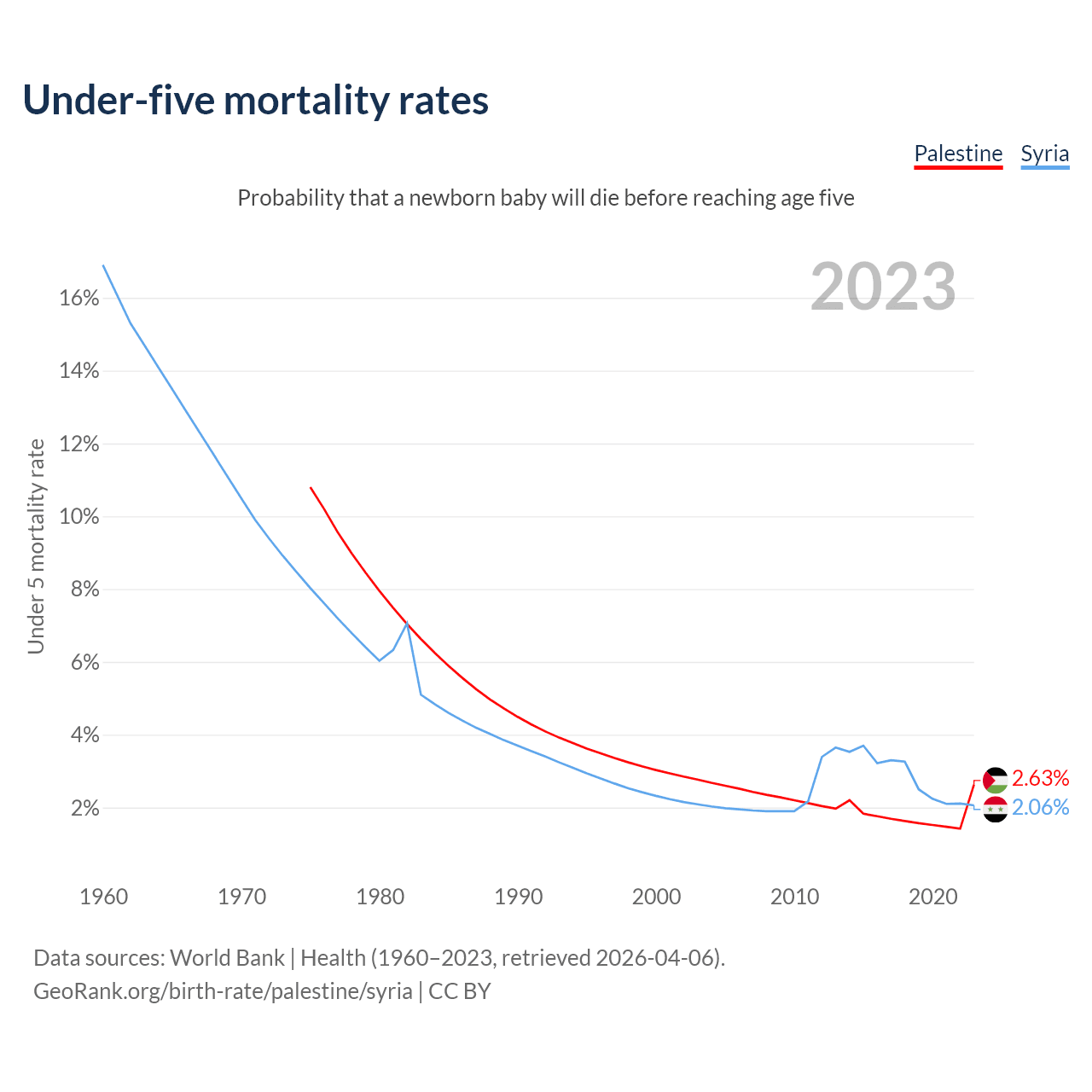 The chance that a newborn baby will die before reaching age five is 2.63% in Palestine and 2.06% in Syria. Above is a chart with historical data on under-five mortality rates.