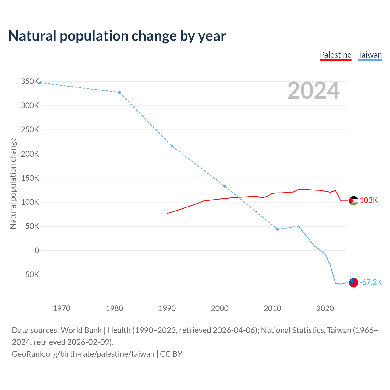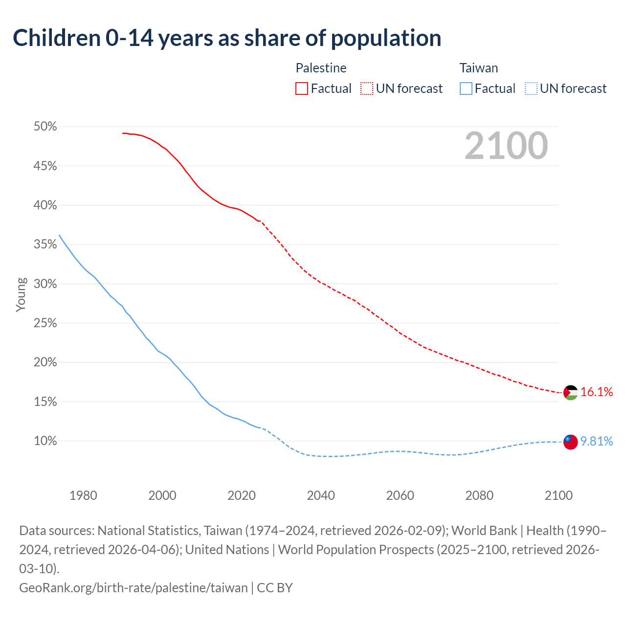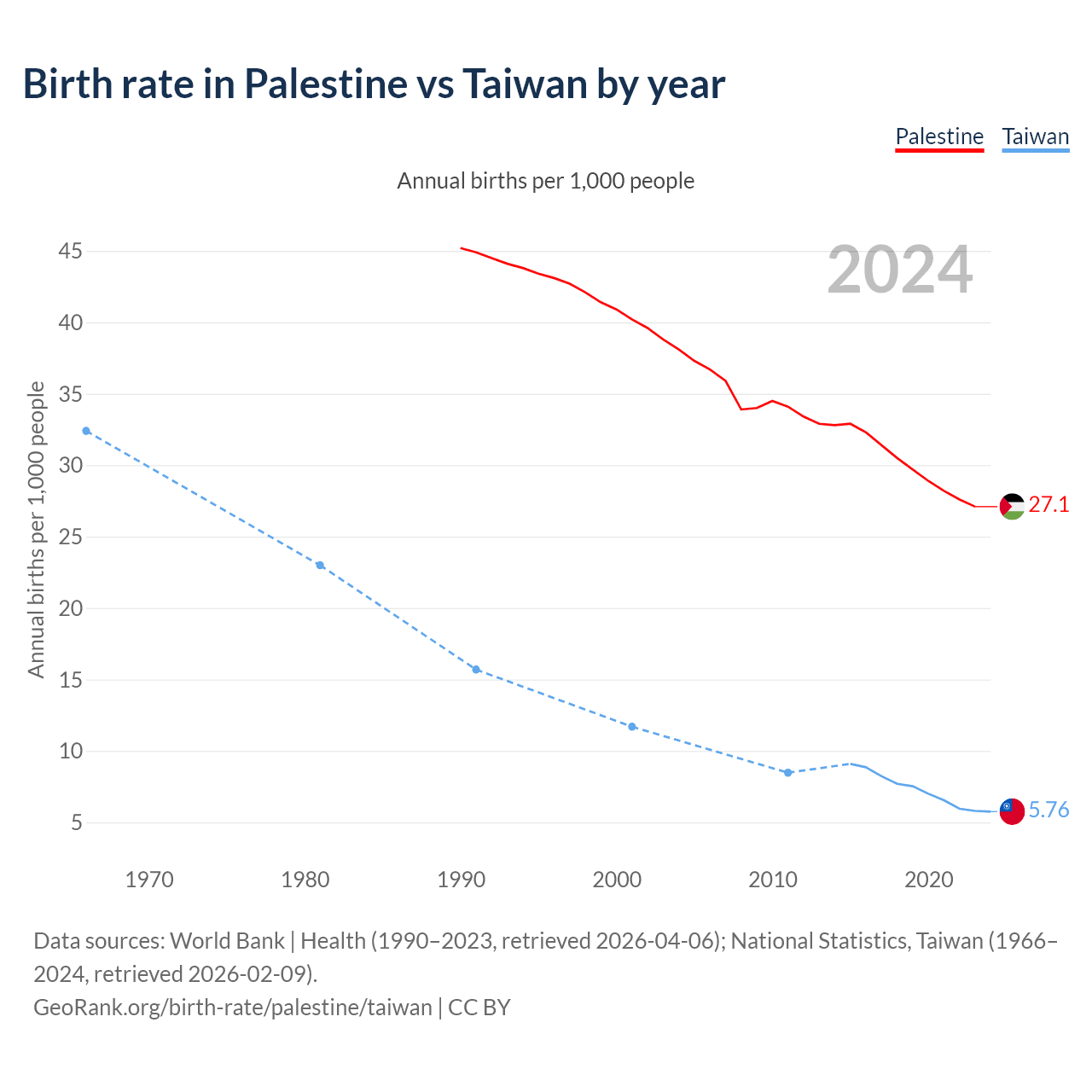 Palestine has an annual birth rate of 27.1 births per 1,000 people, compared to 5.76 for Taiwan. The average number of children a woman is expected to have during her lifetime — the fertility rate, is 3.31 in Palestine and 0.89 in Taiwan — 73.3% difference.