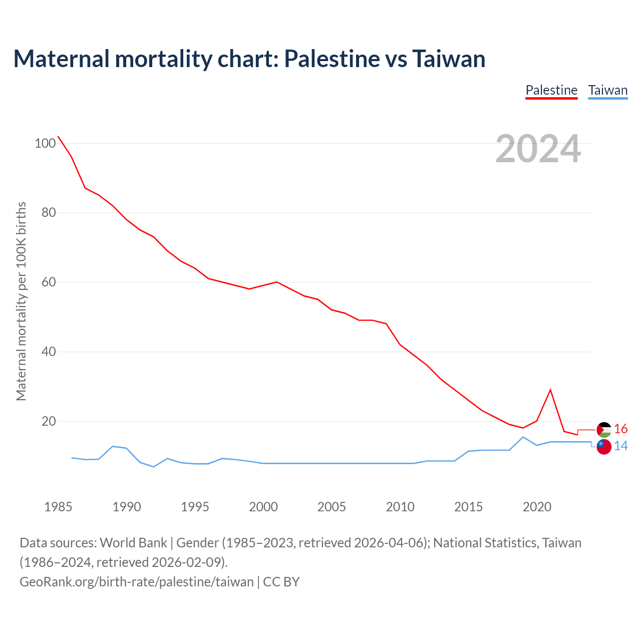 The maternal mortality rate, which is the probability of dying during childbirth or within 42 days of pregnancy termination, is 16 deaths per 100,000 live births in Palestine, compared to 14 deaths in Taiwan.