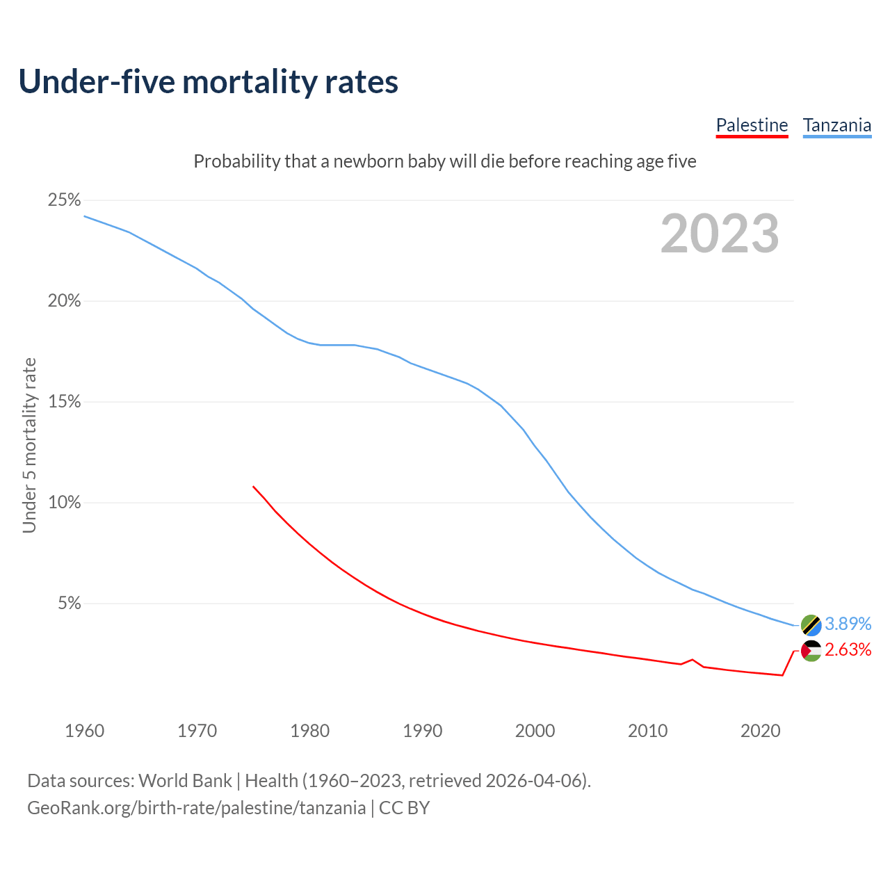 The chance that a newborn baby will die before reaching age five is 2.63% in Palestine and 3.89% in Tanzania. Above is a chart with historical data on under-five mortality rates.