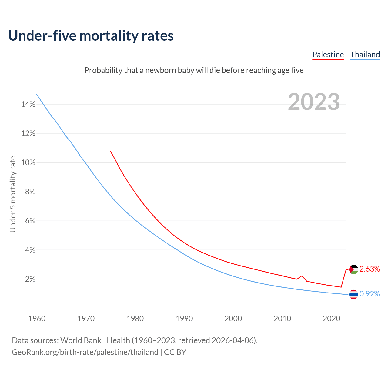 The chance that a newborn baby will die before reaching age five is 2.63% in Palestine and 0.92% in Thailand. Above is a chart with historical data on under-five mortality rates.