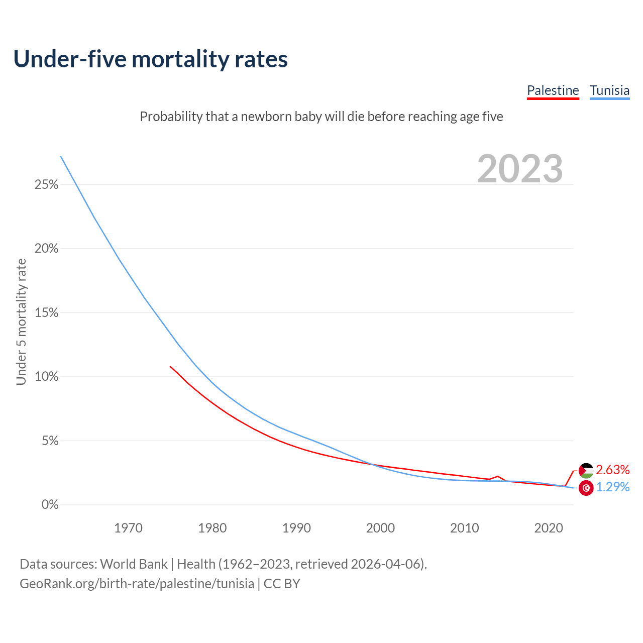 The chance that a newborn baby will die before reaching age five is 2.63% in Palestine and 1.29% in Tunisia. Above is a chart with historical data on under-five mortality rates.
