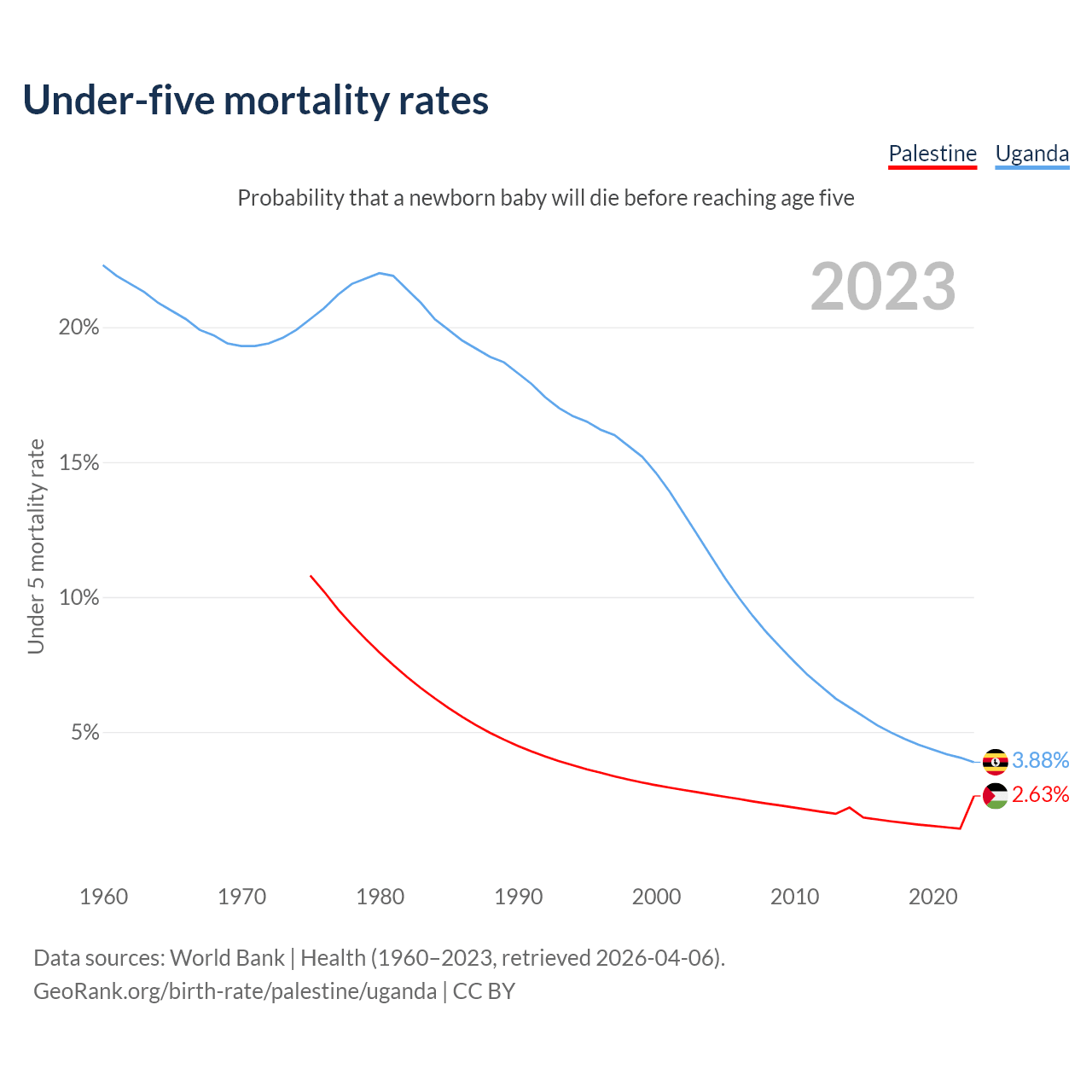 The chance that a newborn baby will die before reaching age five is 2.63% in Palestine and 3.88% in Uganda. Above is a chart with historical data on under-five mortality rates.