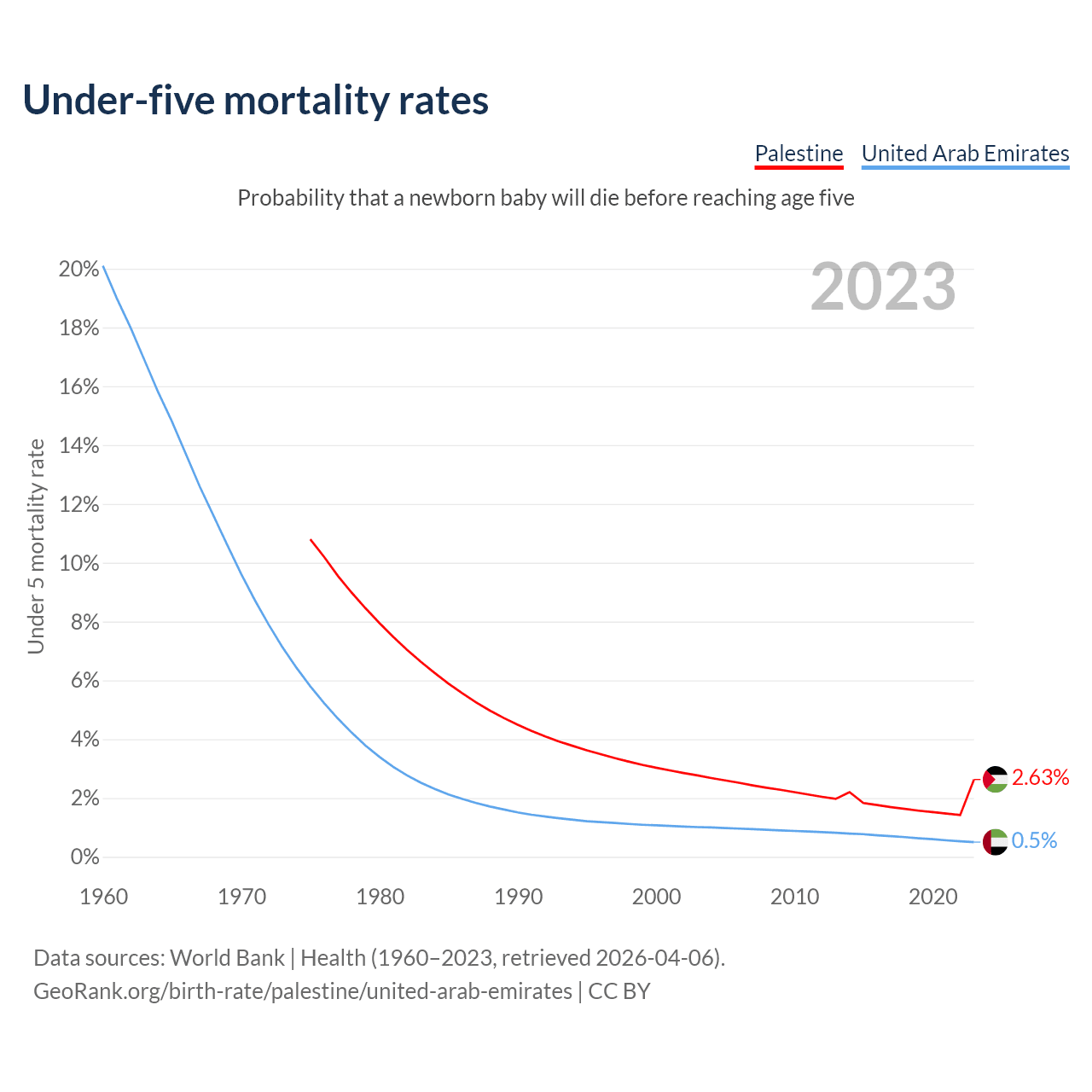 The chance that a newborn baby will die before reaching age five is 2.63% in Palestine and 0.5% in the United Arab Emirates. Above is a chart with historical data on under-five mortality rates.