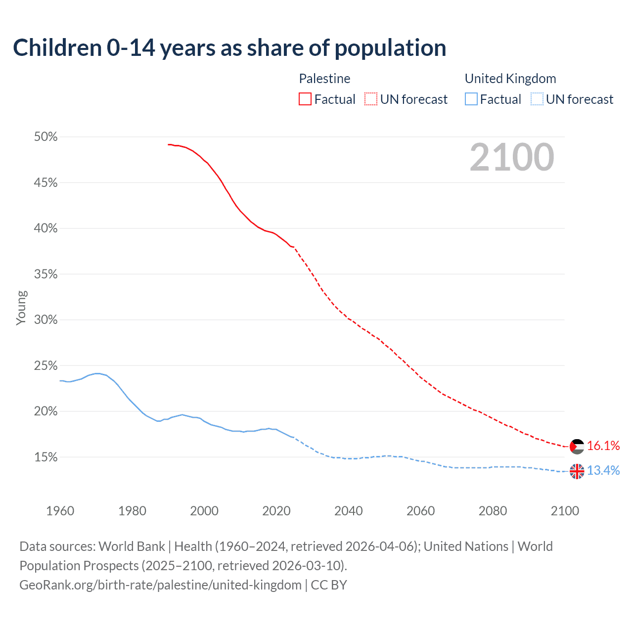 Palestine has an annual birth rate of 27.1 births per 1,000 people, compared to 10 for the United Kingdom. The average number of children a woman is expected to have during her lifetime — the fertility rate, is 3.31 in Palestine and 1.56 in the United Kingdom — 52.9% difference.