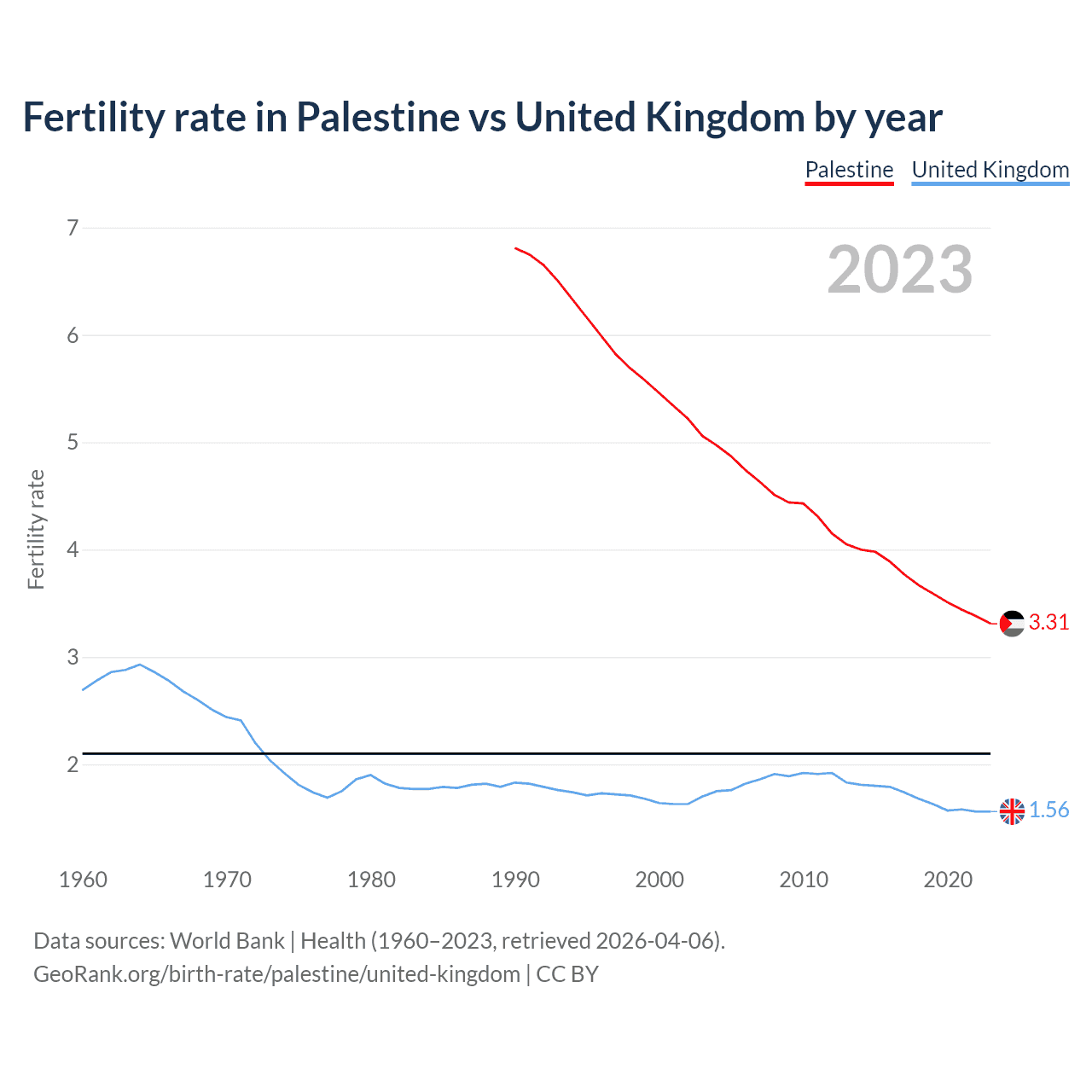 According to the latest available data on birth rates, the fertility rate in Palestine was 3.31 children per woman in 2023, compared to 1.56 in the United Kingdom in 2023. The replacement level is considered to be 2.1 children per woman.