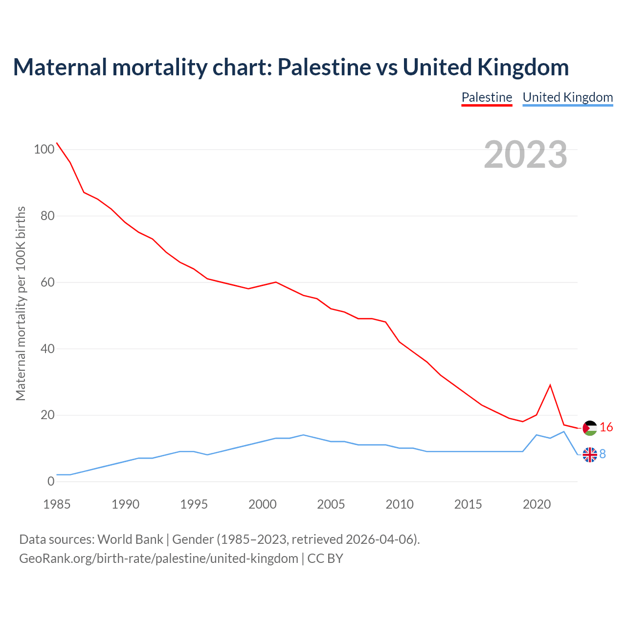 The maternal mortality rate, which is the probability of dying during childbirth or within 42 days of pregnancy termination, is 16 deaths per 100,000 live births in Palestine, compared to 8 deaths in the United Kingdom.
