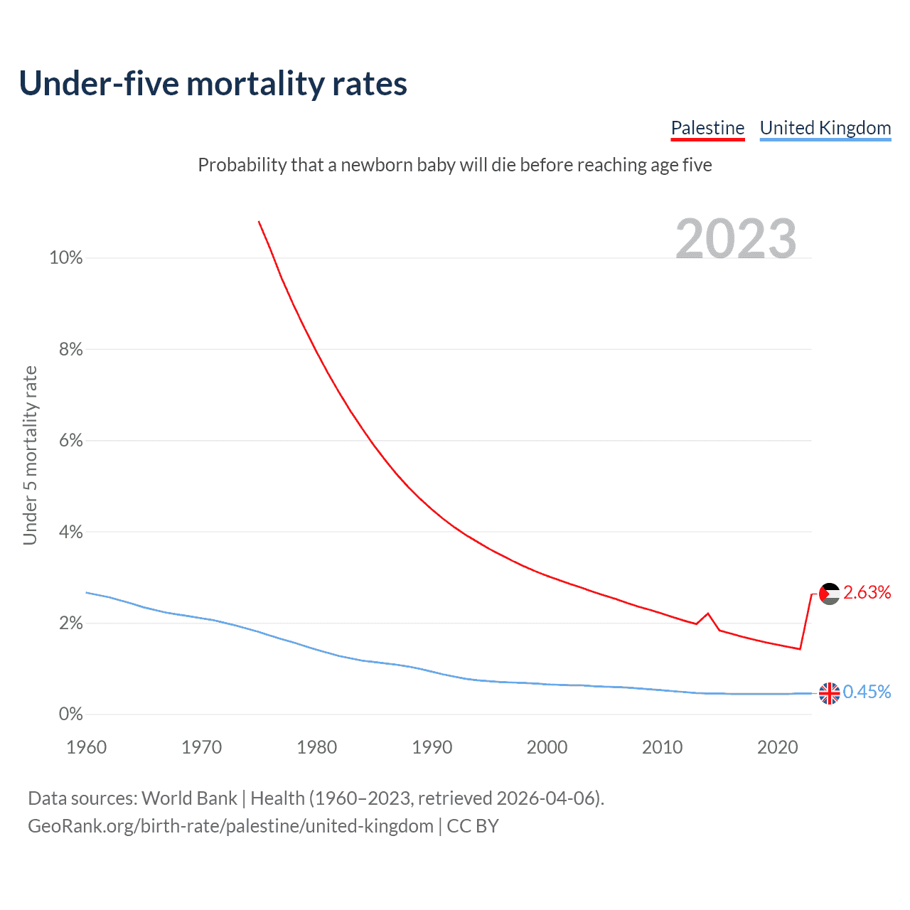 The chance that a newborn baby will die before reaching age five is 2.63% in Palestine and 0.45% in the United Kingdom. Above is a chart with historical data on under-five mortality rates.