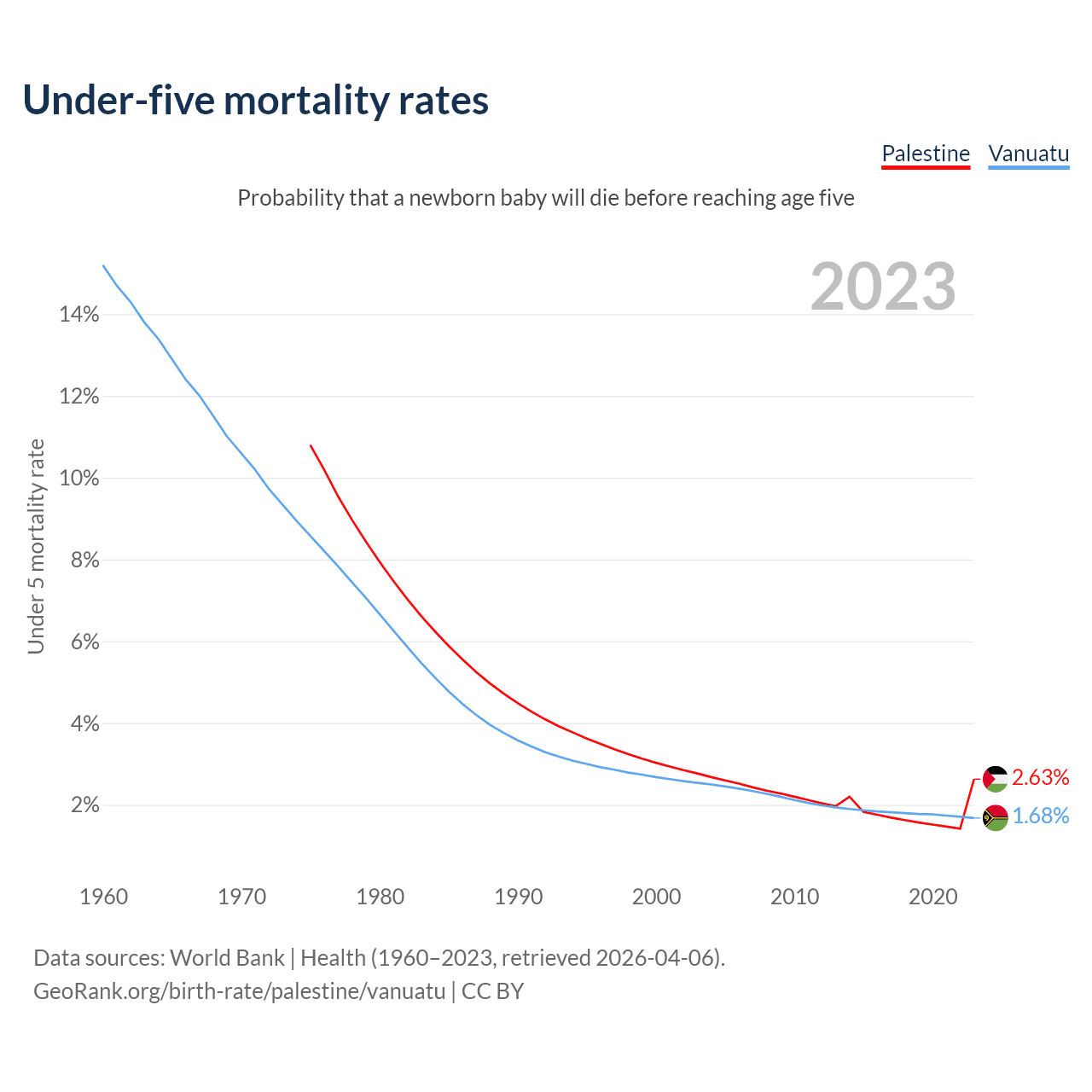 The chance that a newborn baby will die before reaching age five is 2.63% in Palestine and 1.68% in Vanuatu. Above is a chart with historical data on under-five mortality rates.