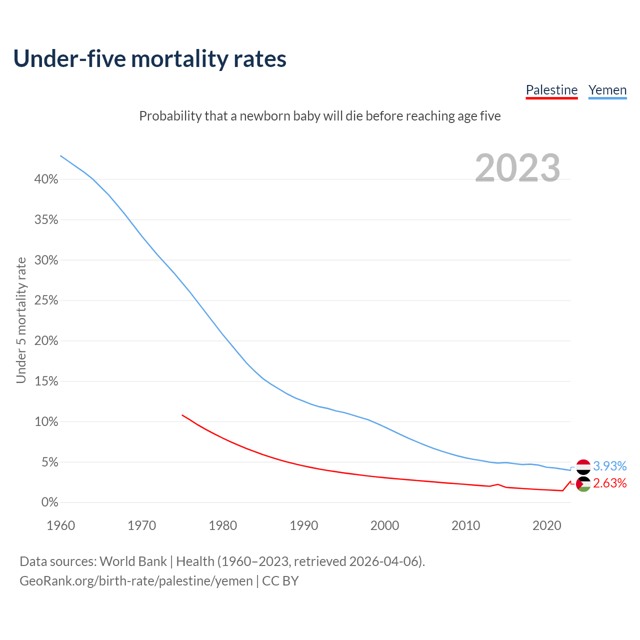 The chance that a newborn baby will die before reaching age five is 2.63% in Palestine and 3.93% in Yemen. Above is a chart with historical data on under-five mortality rates.